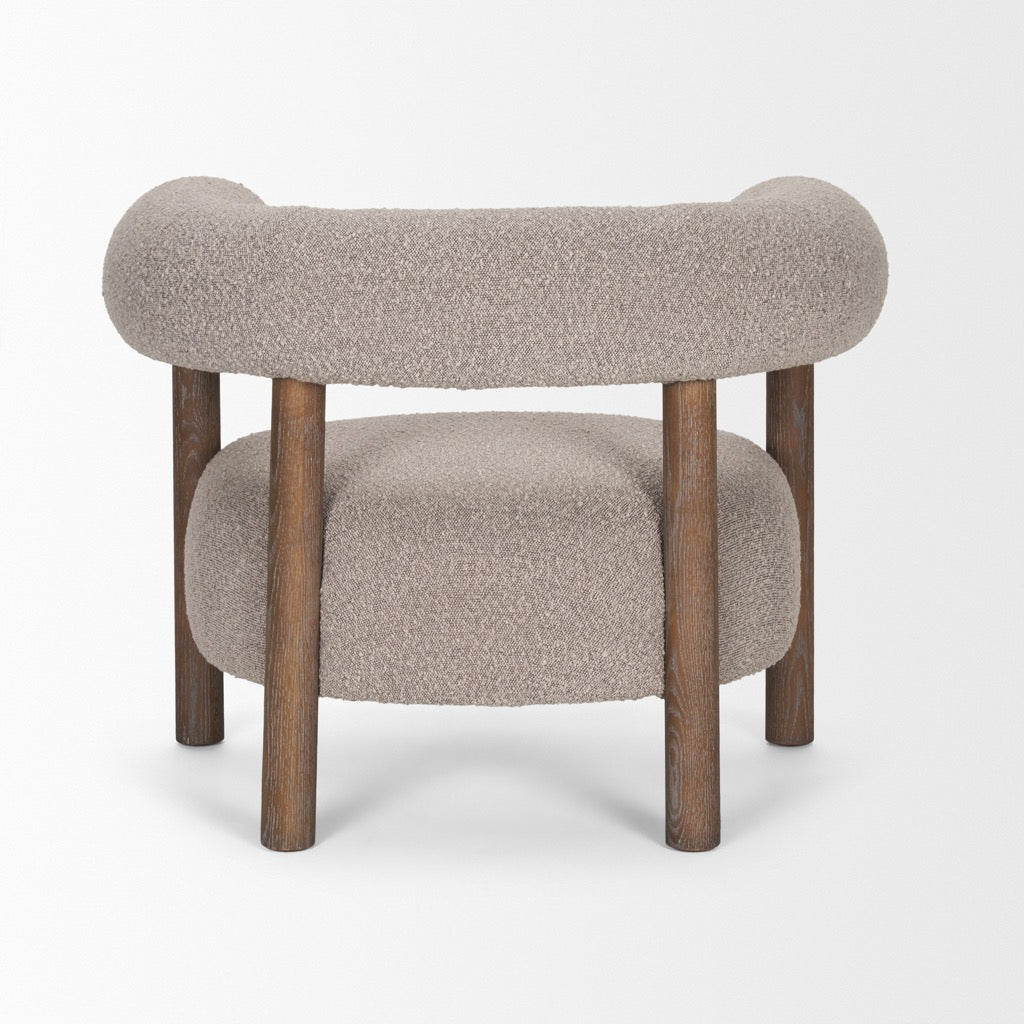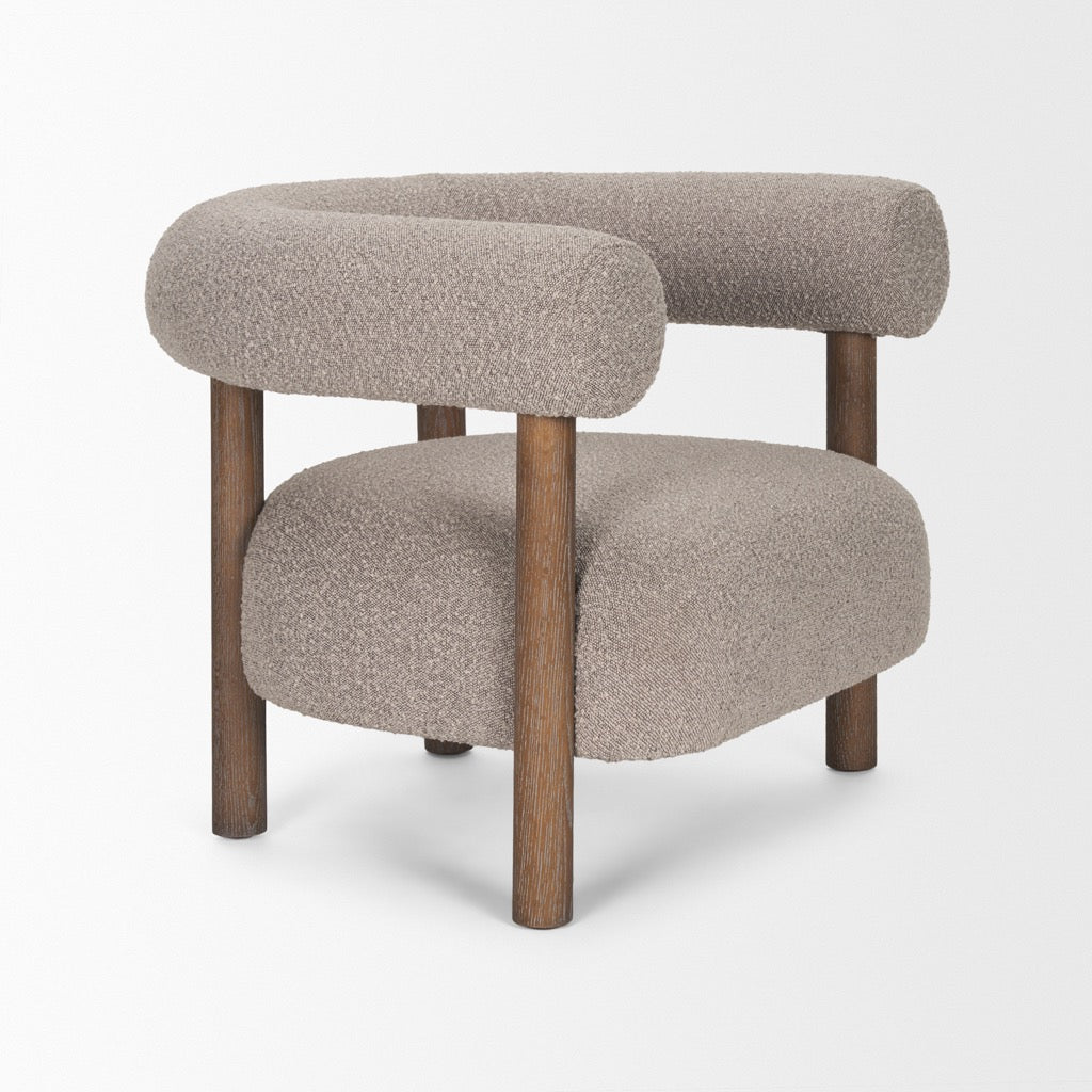 The Gianna Accent Chair is an open-back design, upholstered in a nubby taupe boucle fabric with medium brown wood legs.