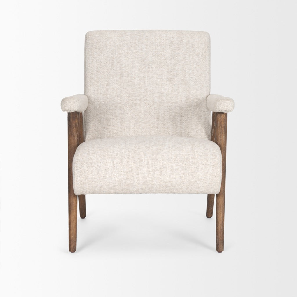 The Nico Accent Chair is upholstered in oatmeal fabric and supported by tapered wooden legs in a medium brown finish with subtle white pickling.