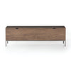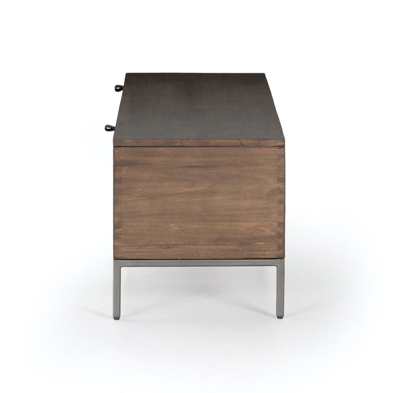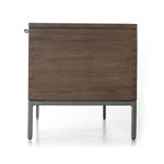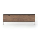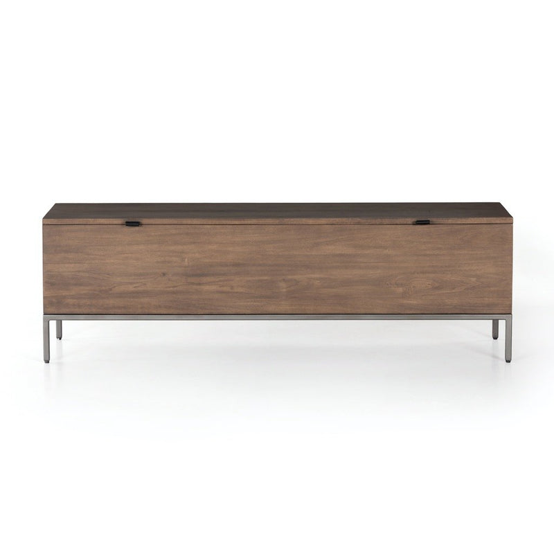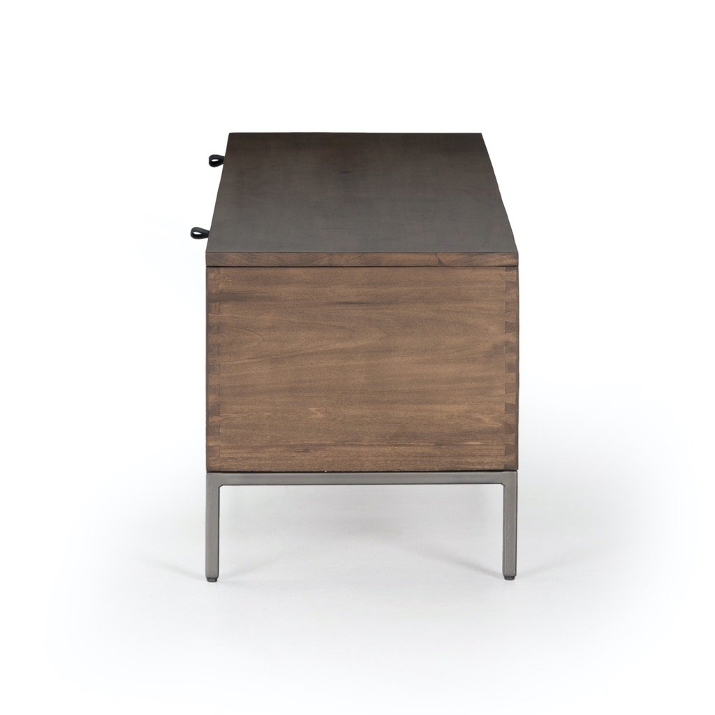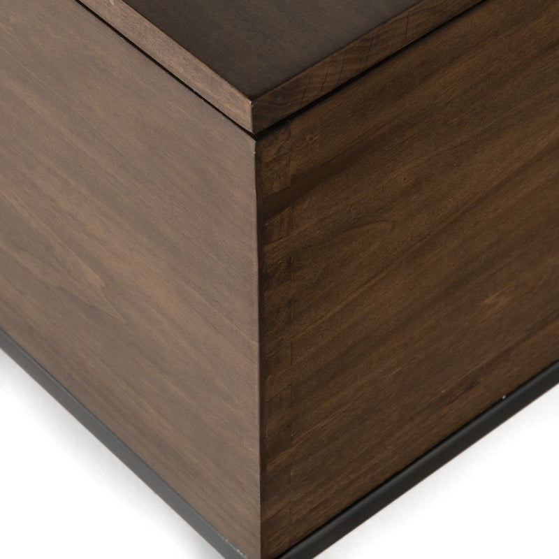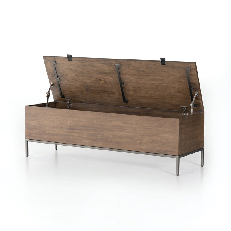 A spacious trunk of auburn and black-washed poplar is perfect when styled at the foot of the bed for storage of extra blankets, linens, seasonal items, and more. Black top-grain leather pulls add modernity.