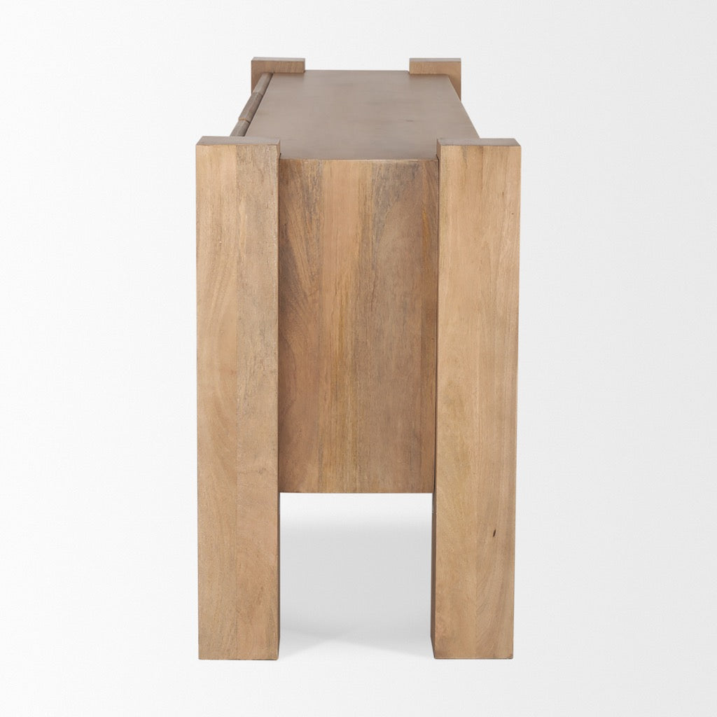 - Materials: Crafted from mango wood and finished in a soft light brown stain with subtle white pickling.