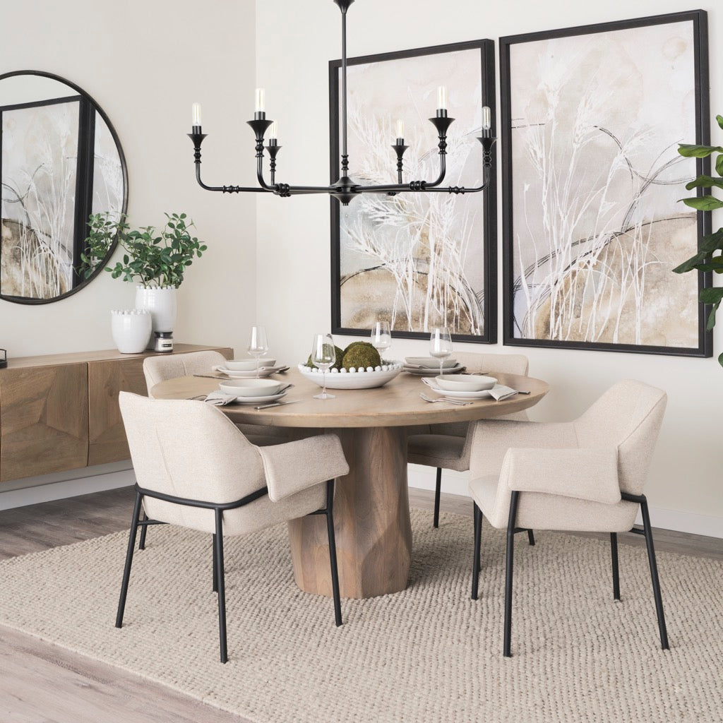 The Brently Dining Chair in oatmeal fabric with matte black iron metal legs.