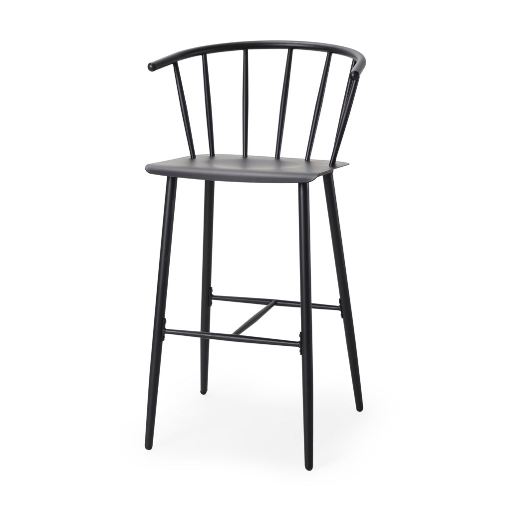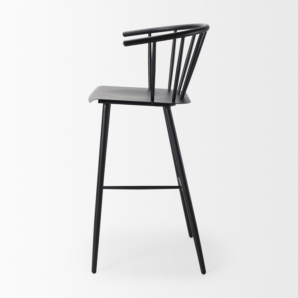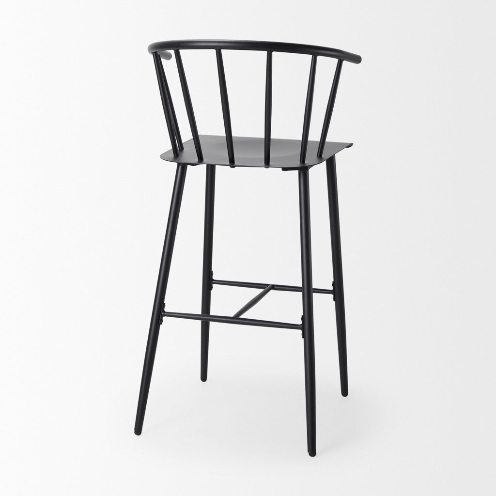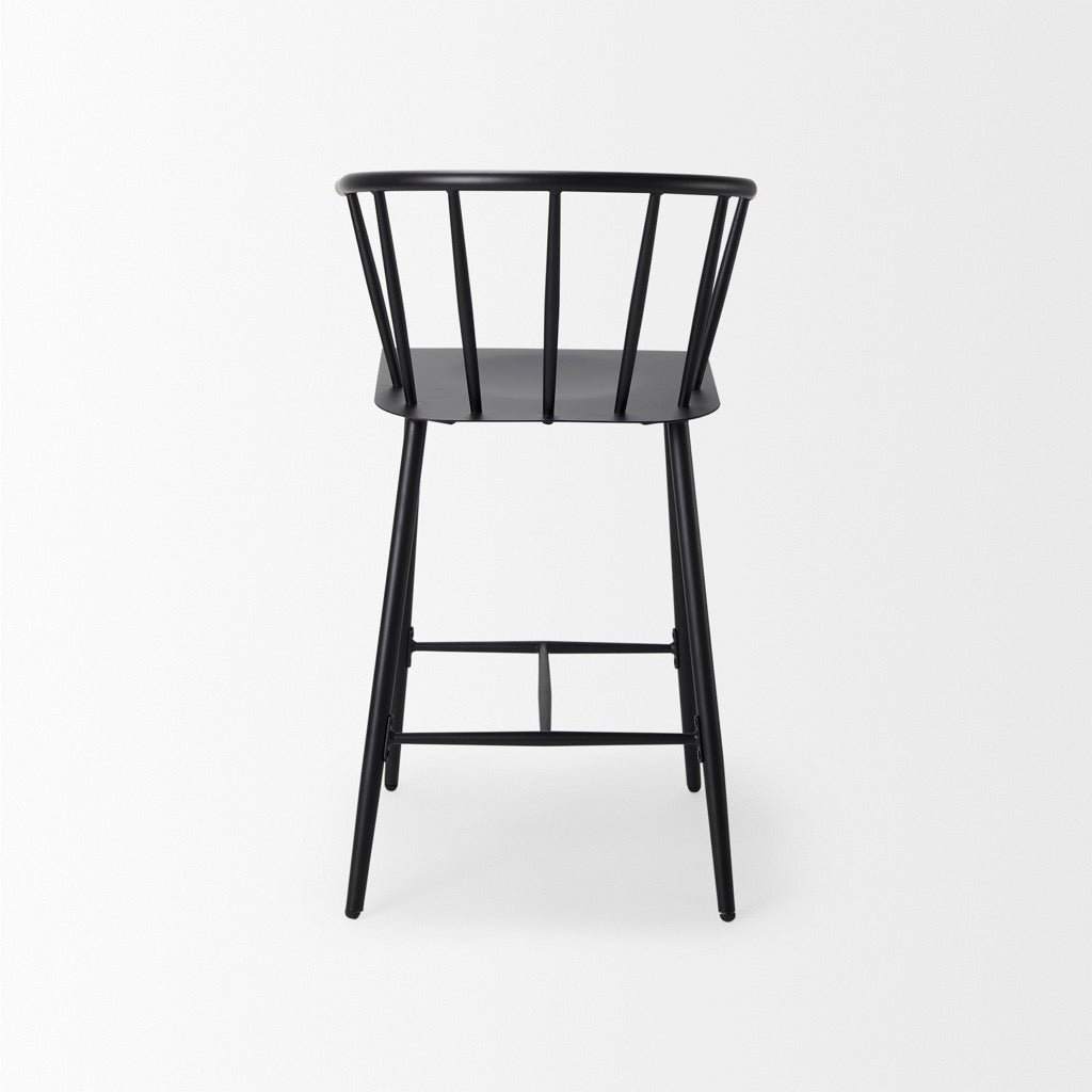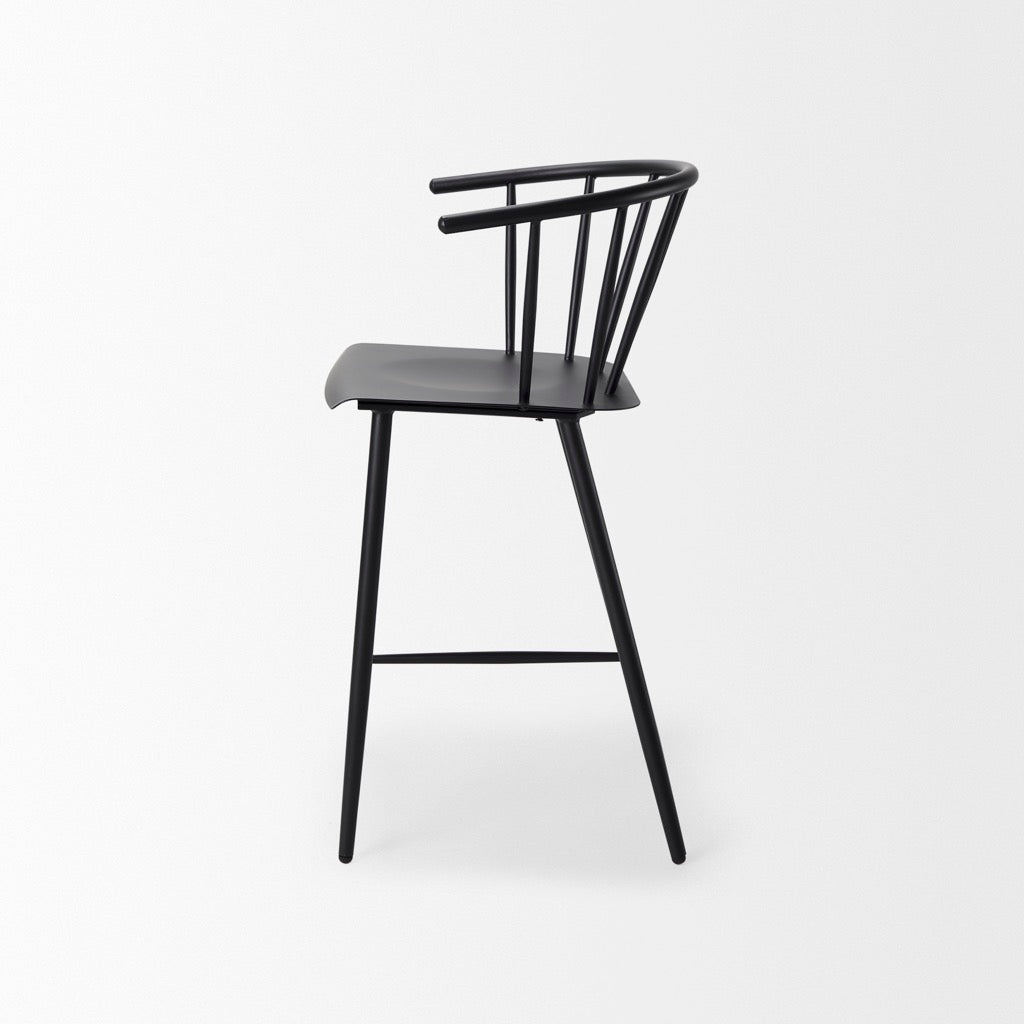 A modern counter or bar stool with a traditional twist, designed in metal and finished with a smooth matte black color.