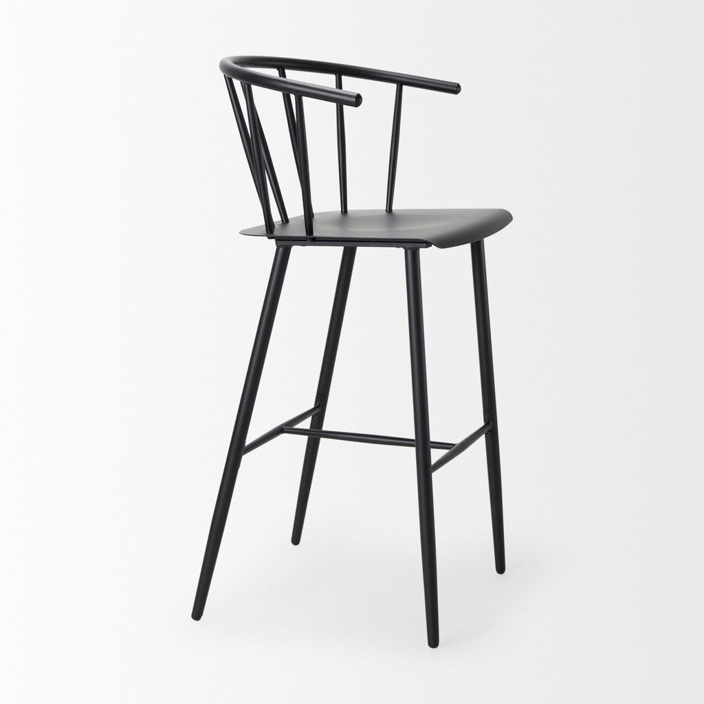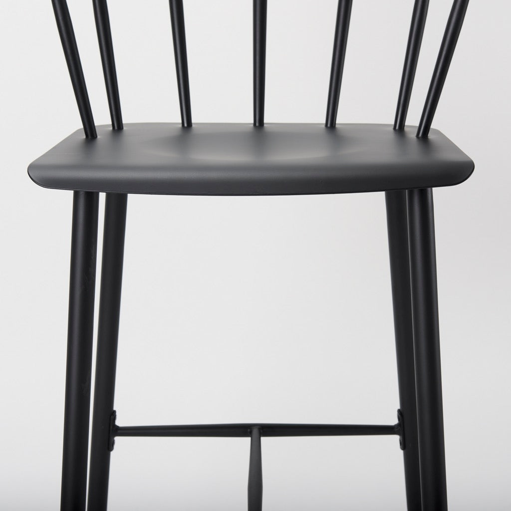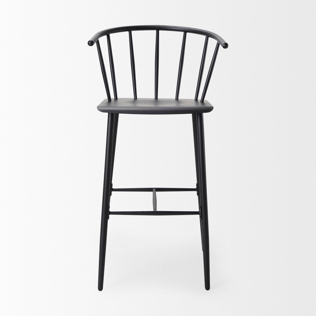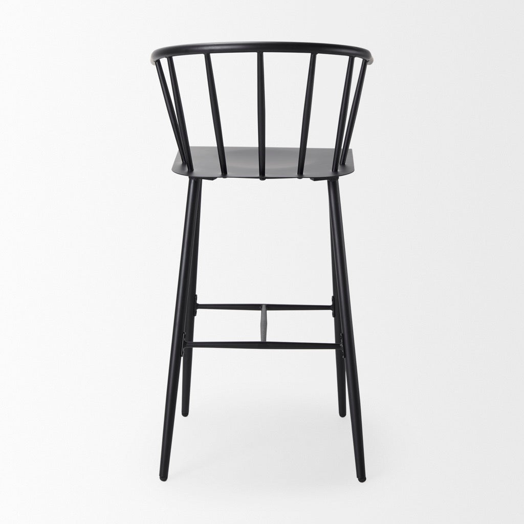 A modern counter or bar stool with a traditional twist, designed in metal and finished with a smooth matte black color.