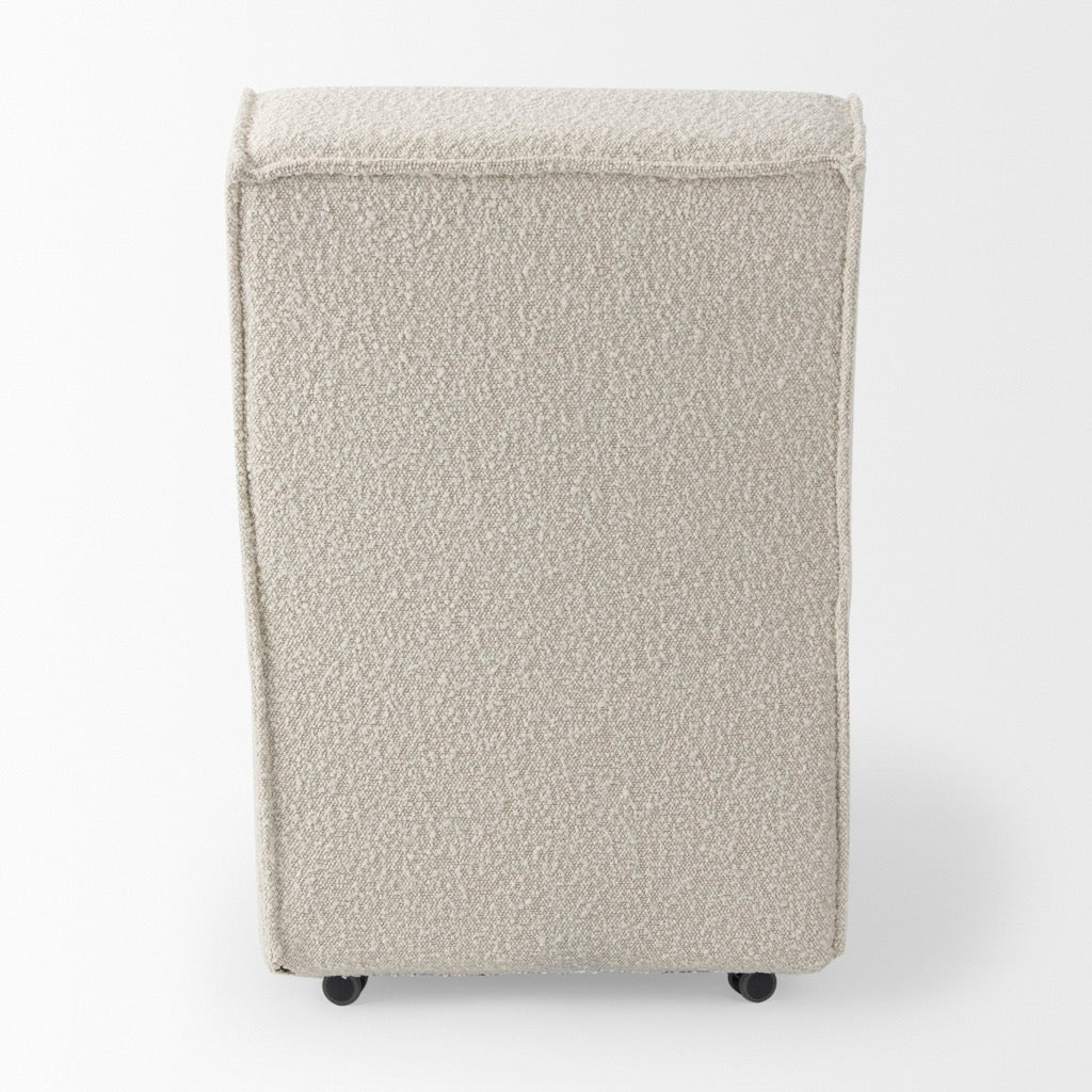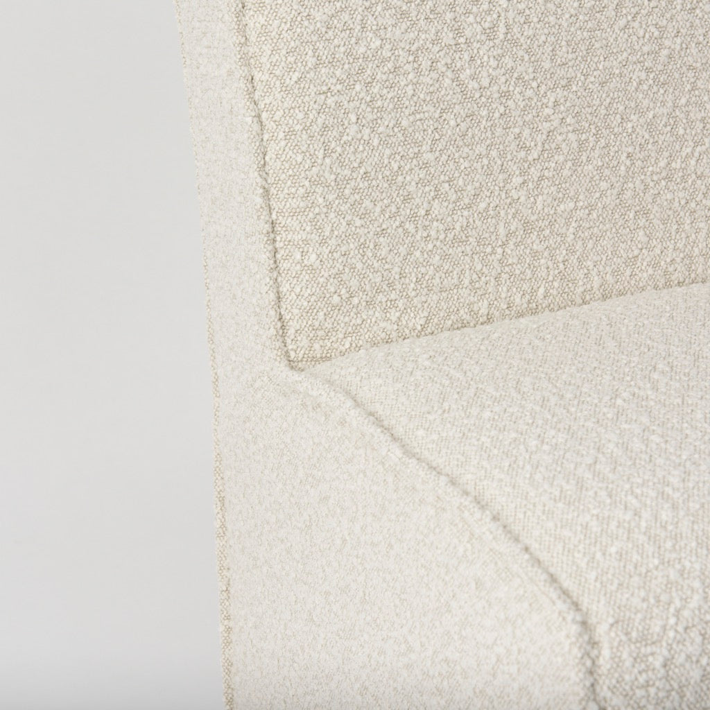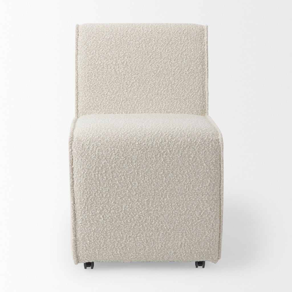 Wrapped in plush cream-toned boucle fabric, the Damon is a ritzy dining chair that is equipped with four wheels for convenient movement.