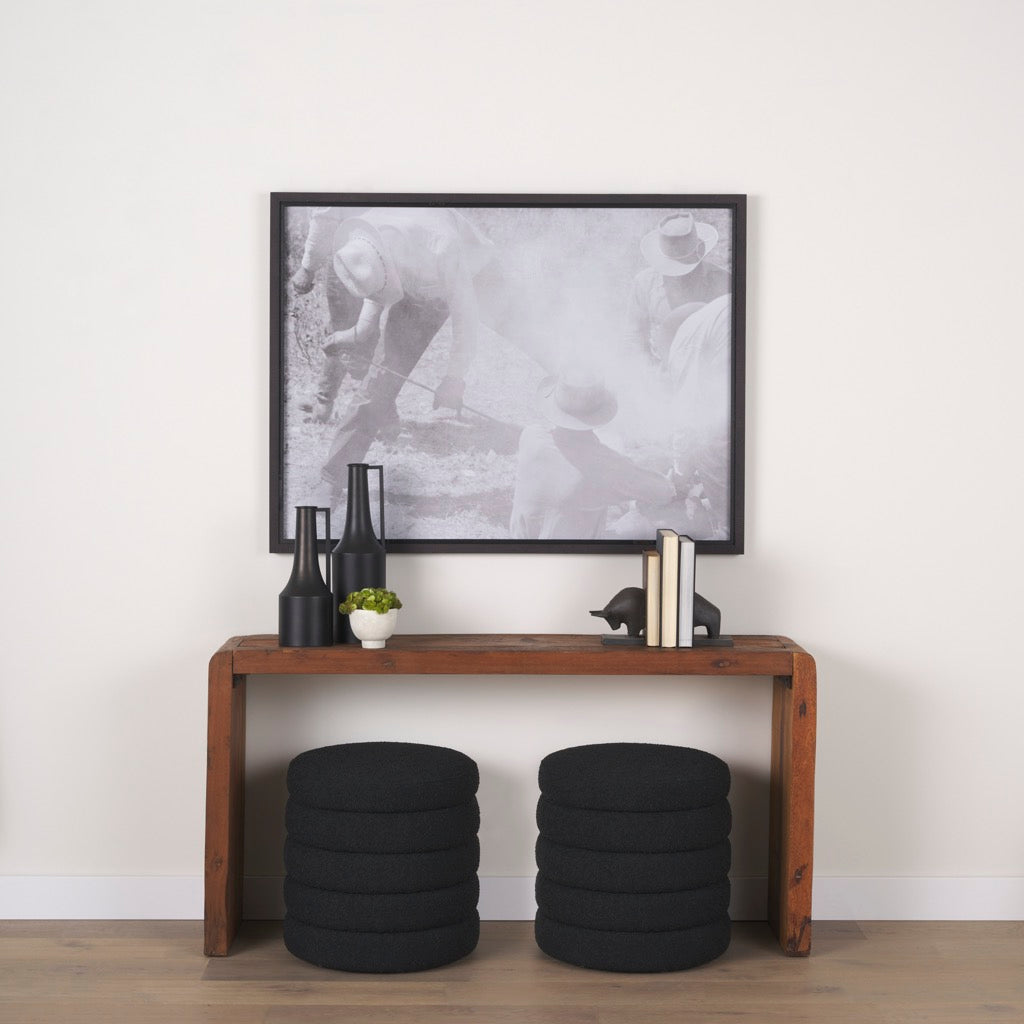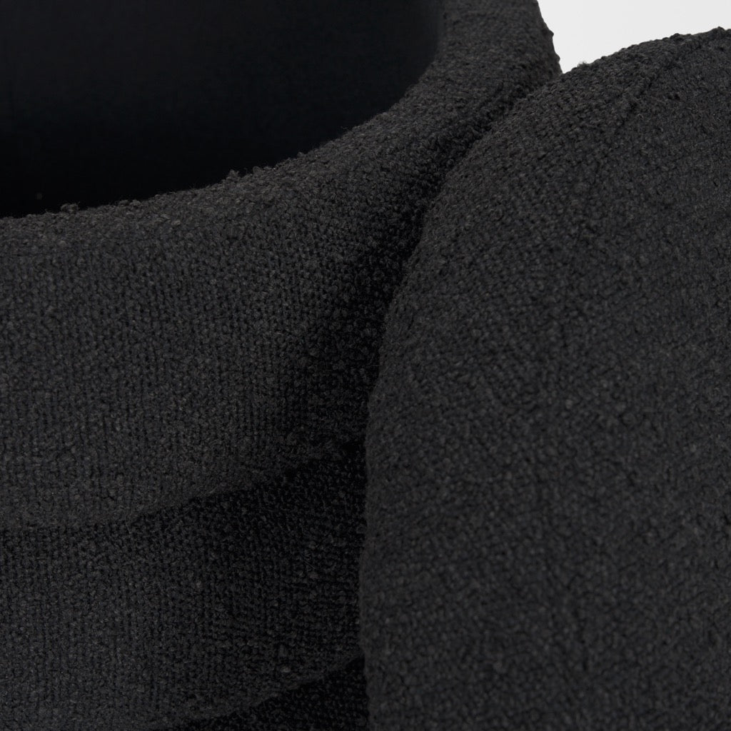 Elise Ottoman is round, upholstered in a black boucle fabric with hidden storage.