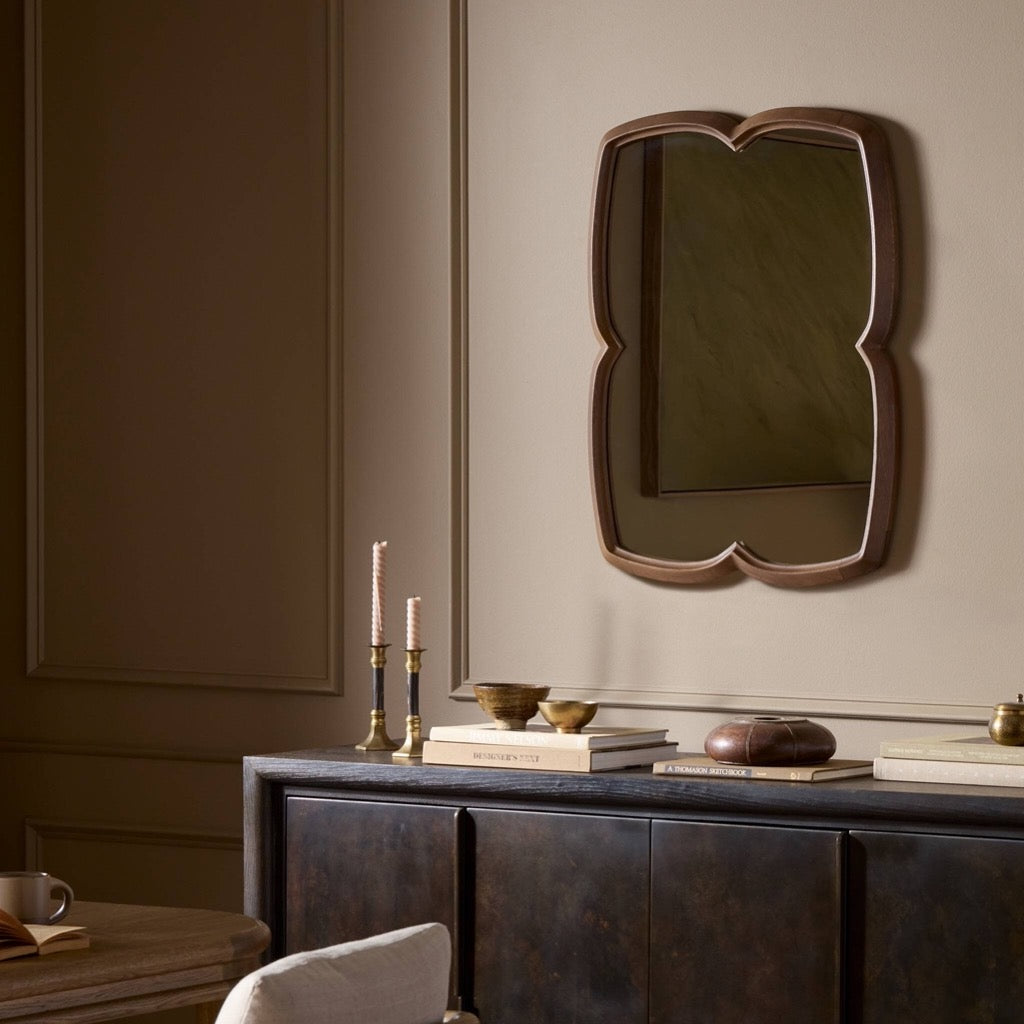 Inspired by floral design, solid oak and iron form the floret petal frame with bullnose detailing for softened edges all around.