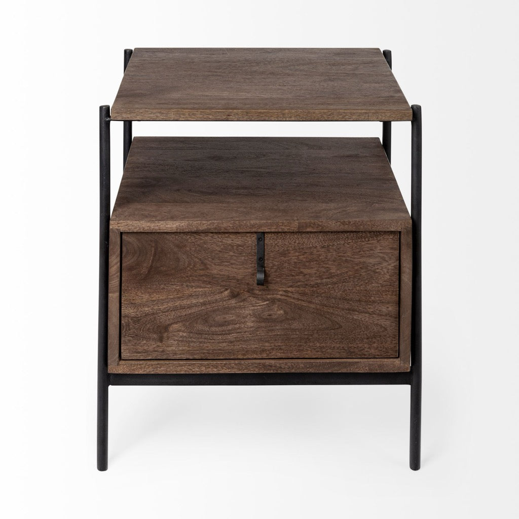 - Solid Wood and Metal Construction: This modern side table, made from solid Mango wood, comprises a single drawer with a shelf-like top supported by a sturdy, iron frame.