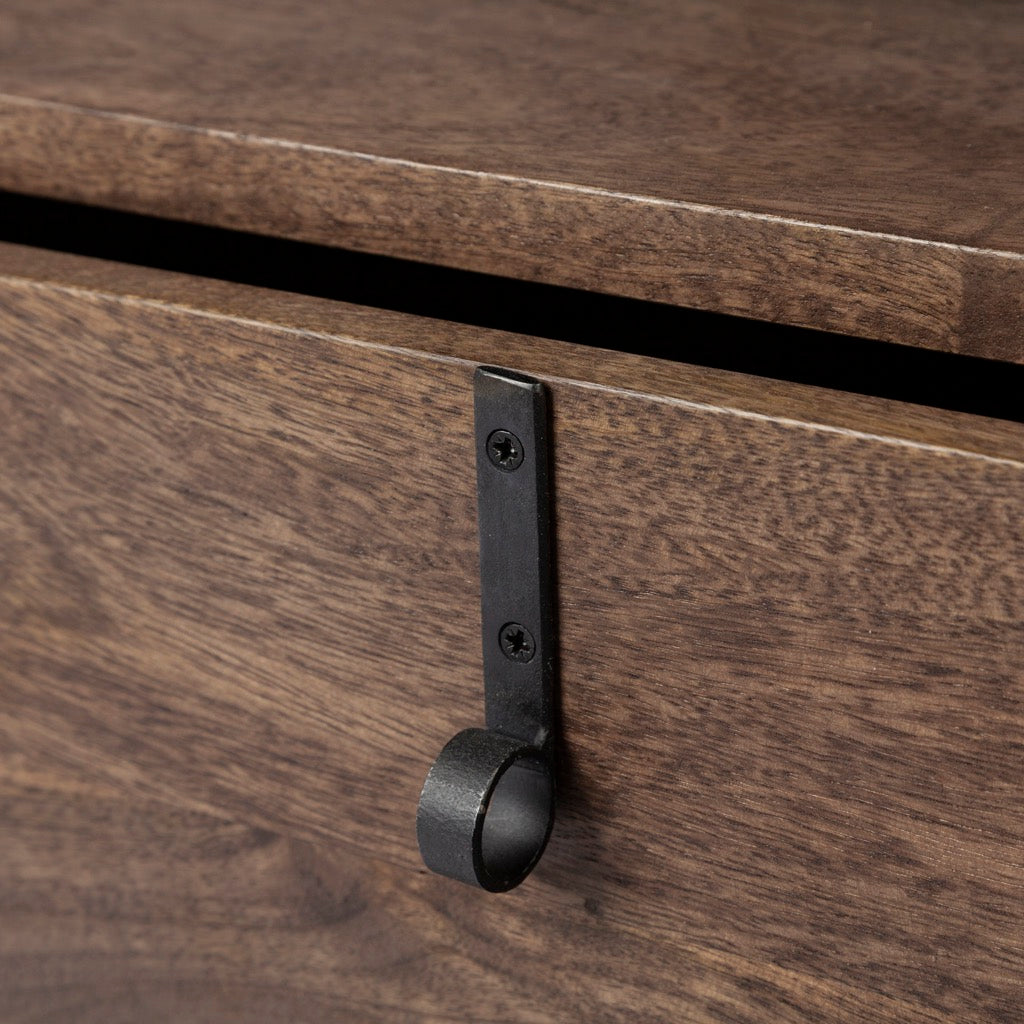 - Dark Brown and Black Finish: The wood is smooth textured in a dark brown finish that lets its natural character show through. The iron legs have an unfussy, matte black finish.
