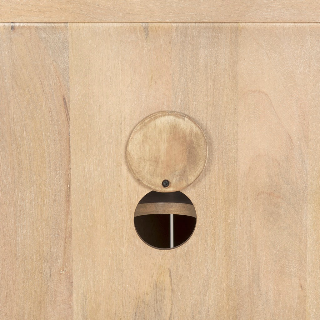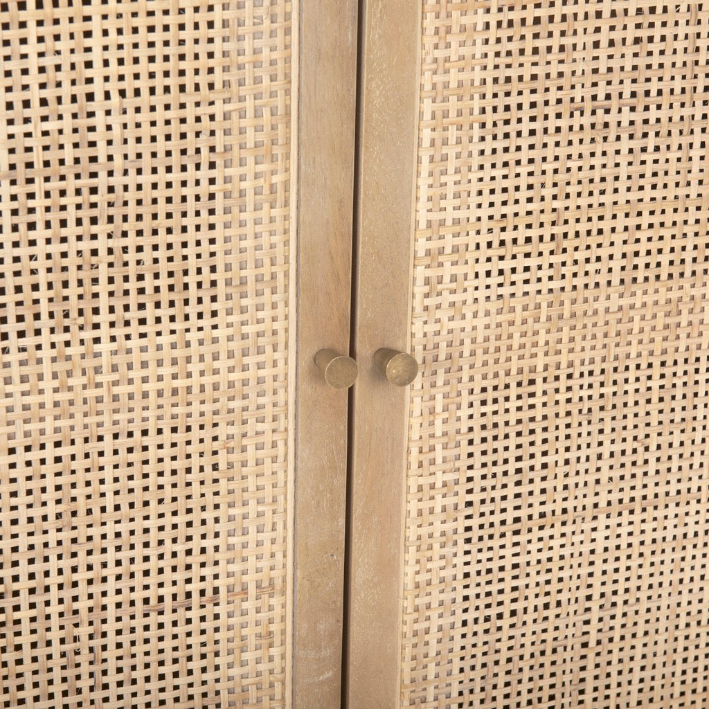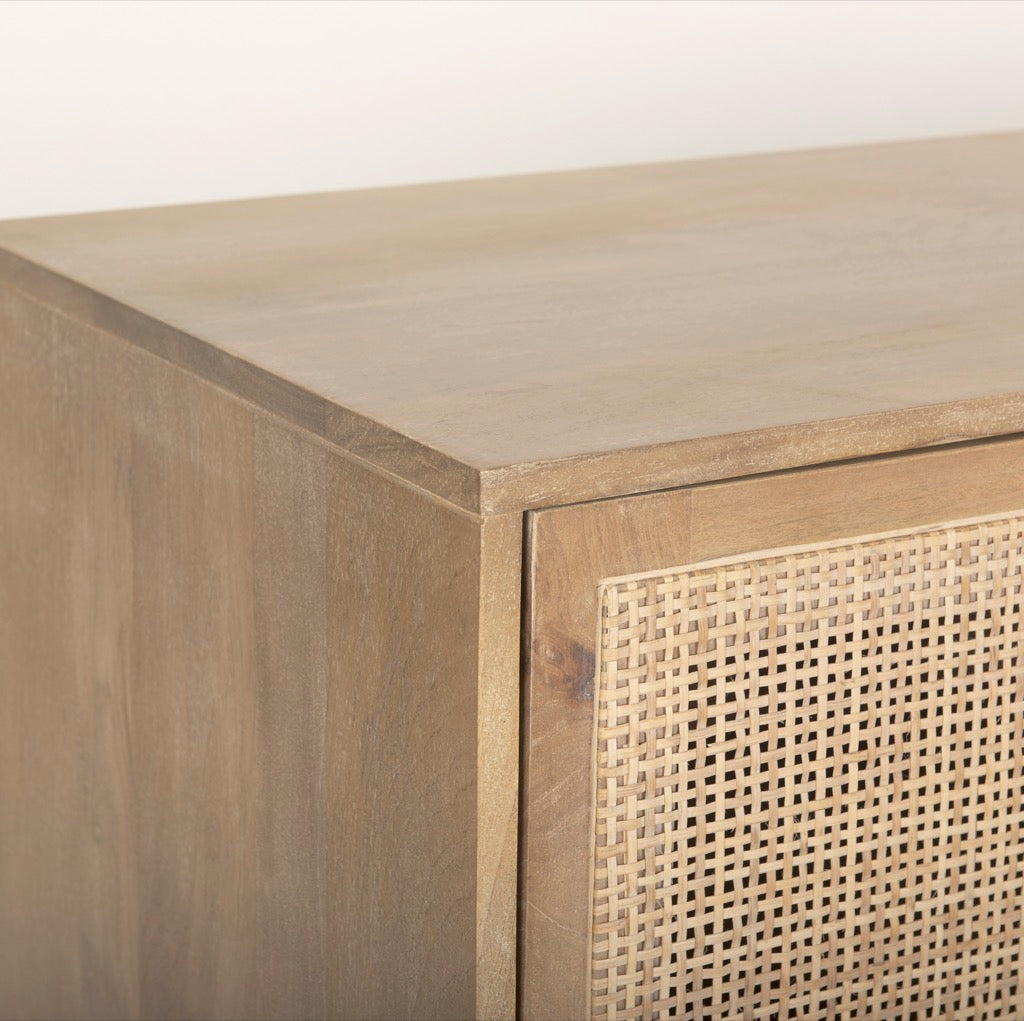 The Grier Sideboard is a light brown mango wood and finished with four cabinet doors that feature a cane lattice door front.