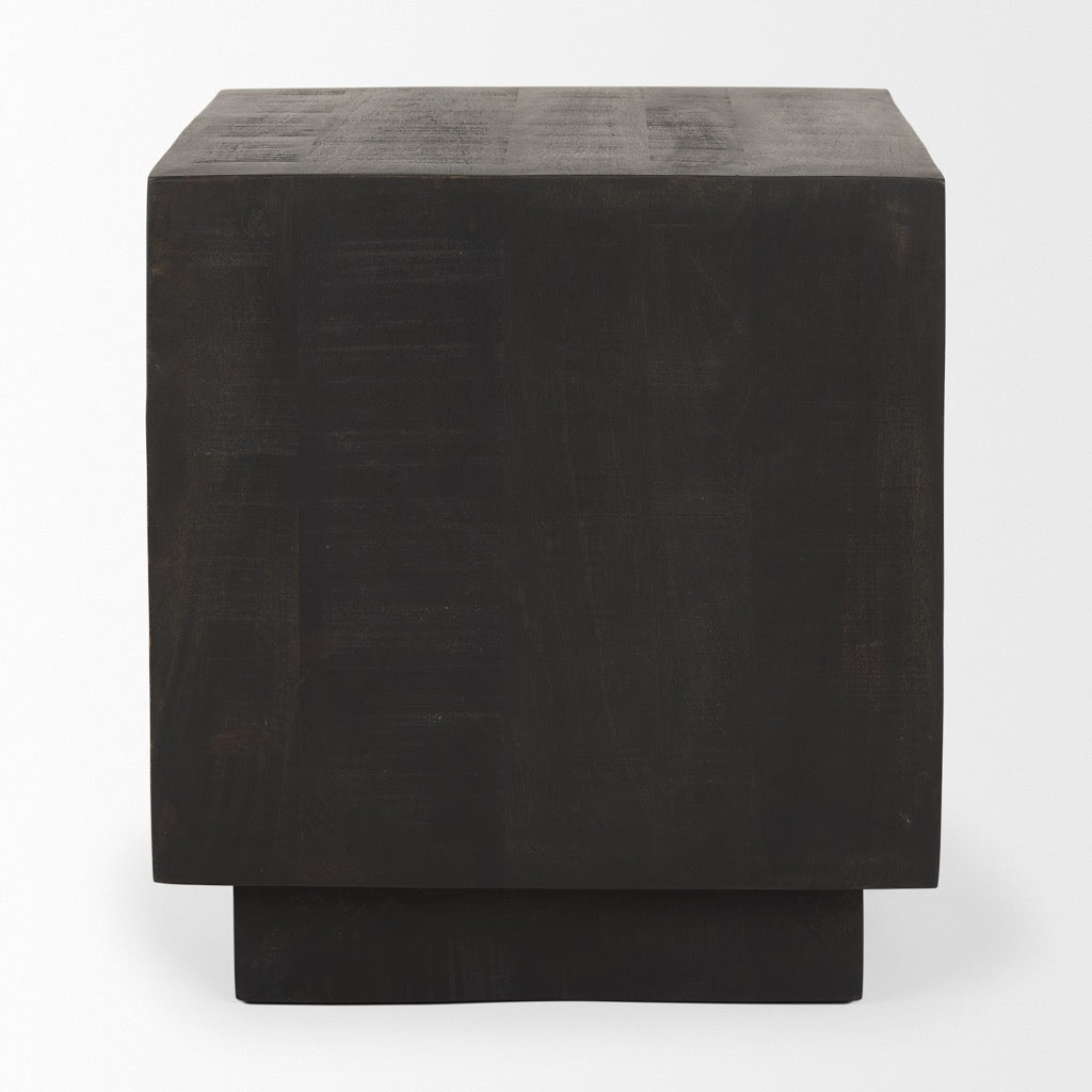 The dark brown Hayden Square End/Side Table features a wooden box-like minimalist design on a recessed base, appearing as though it is "floating" in a room.