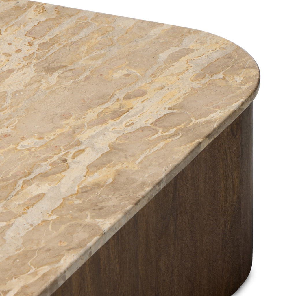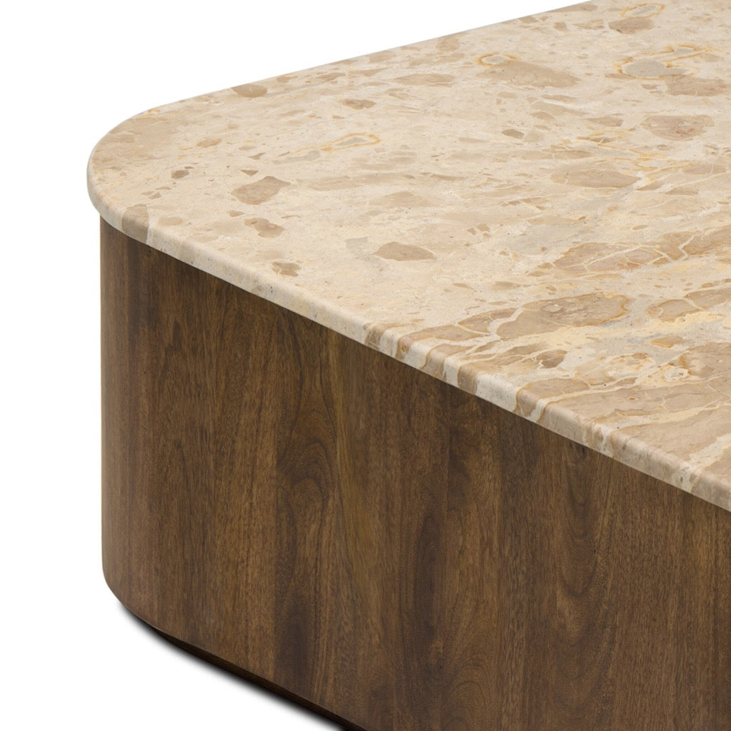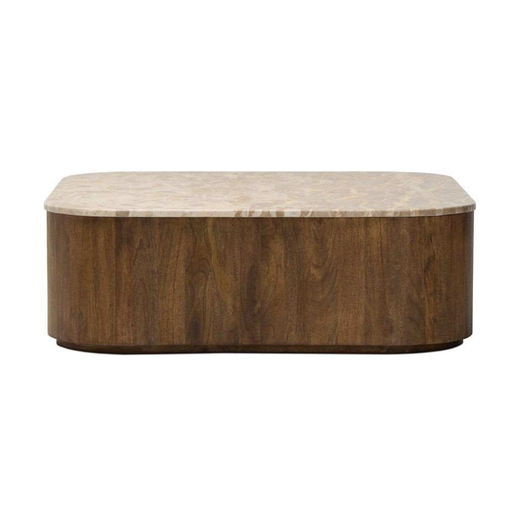 Bold in dimension, this rounded square coffee table features a thick mango wood base with a textural marble top that overhangs for added detail, mirroring the swooped subtle pedestal at the bottom. Rich in texture and detail, natural features get to shine in this single piece of marble. A design collaboration by Amber Lewis and Four Hands. This item has limited online distribution and may not be sold on websites without prior approval. Visit the FAQ page in our Help Center for more details.