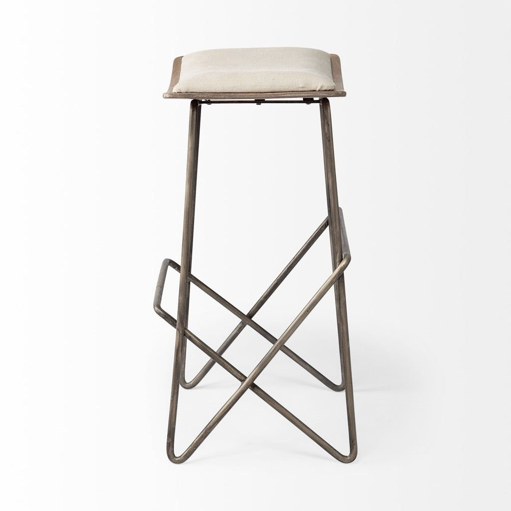 The Katniss Stool features a saddle-style fabric seat mounted atop a sturdy iron base polished in an antiqued-champagne tone.