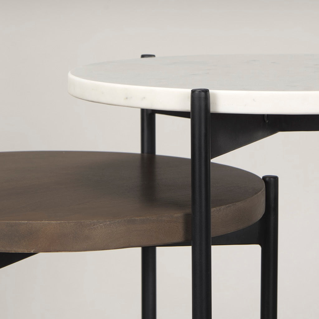 A versatile duo of mixed-media nesting tables. The shorter features a smooth dark brown mango wood table top while the taller hosts a white marble table top.