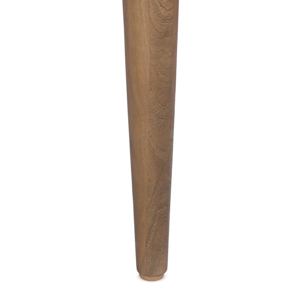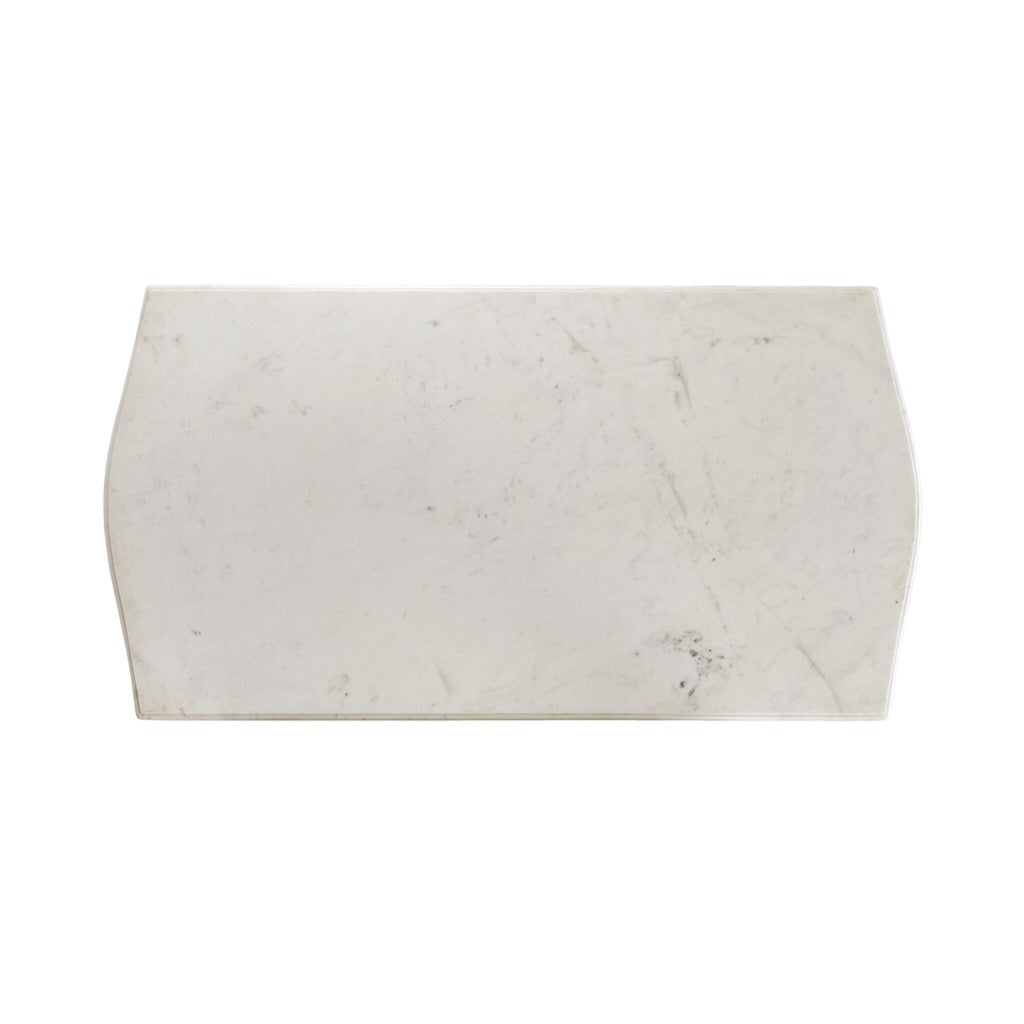 White marble carved into a surface with reverse ogee arches gives new meaning to capsule-shaped tables. Sized for small-scaled gatherings, this dining table is crafted from mango wood with tapered legs that balance the look.