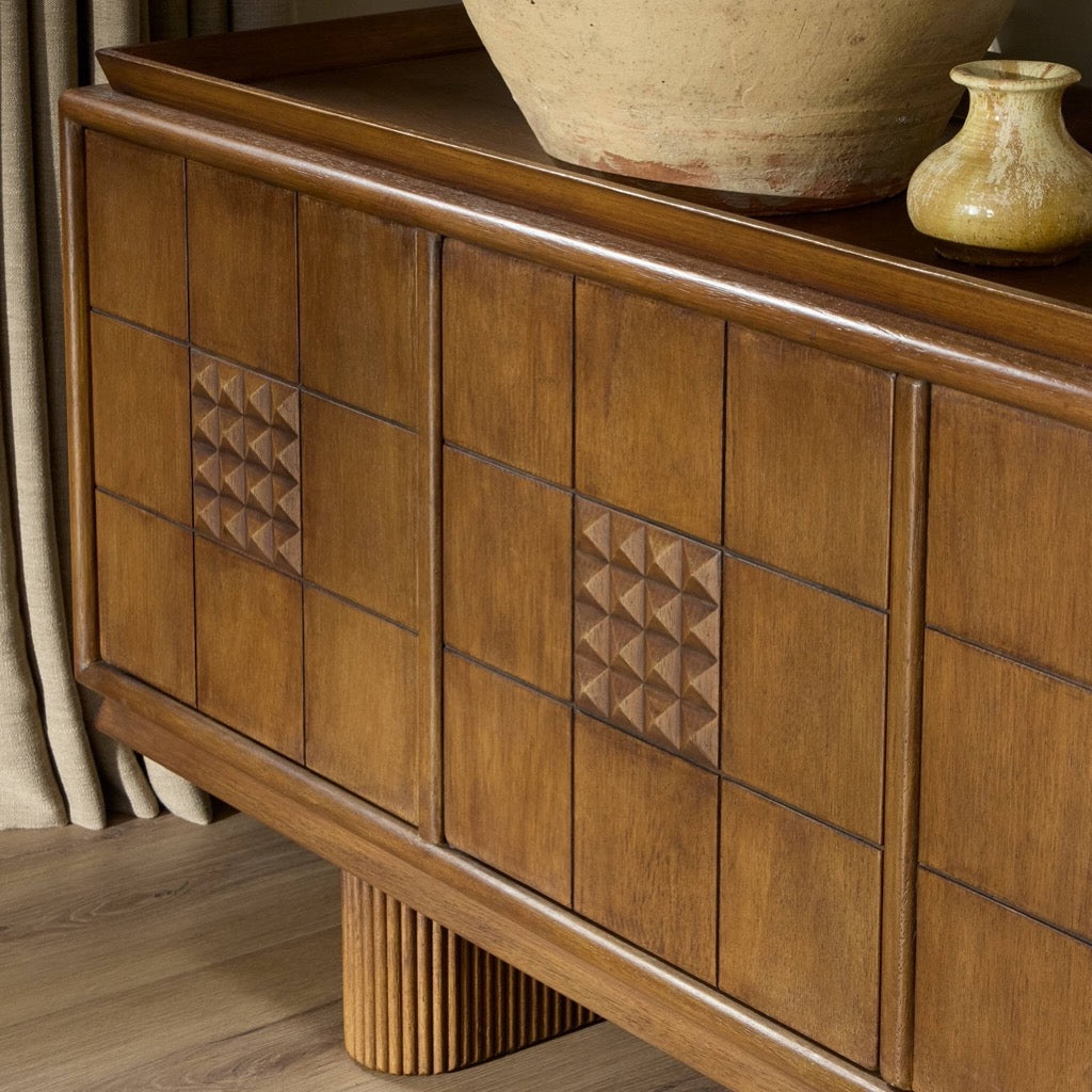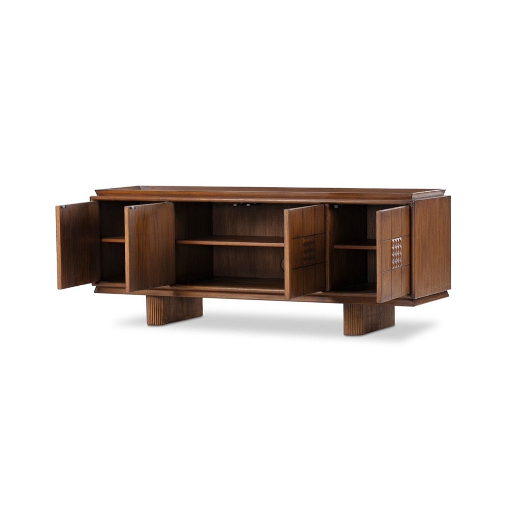 Art Deco-driven media console features textural front doors a tray top and a prominent grid design. Design forward with functional detail, the rust-hued console offers a beautifully unique spot for media components. Rear cutouts for cord management.