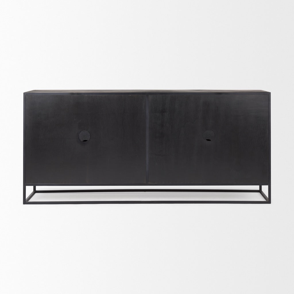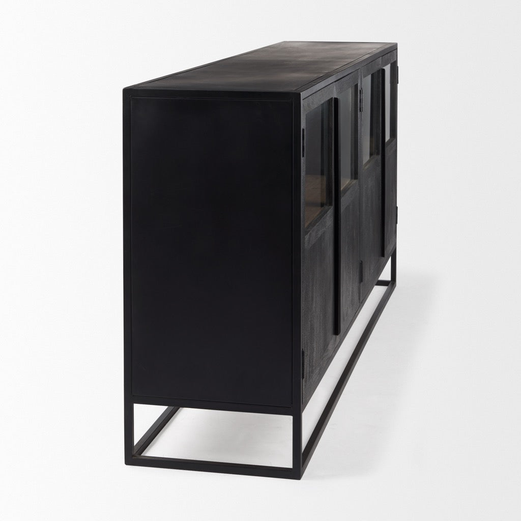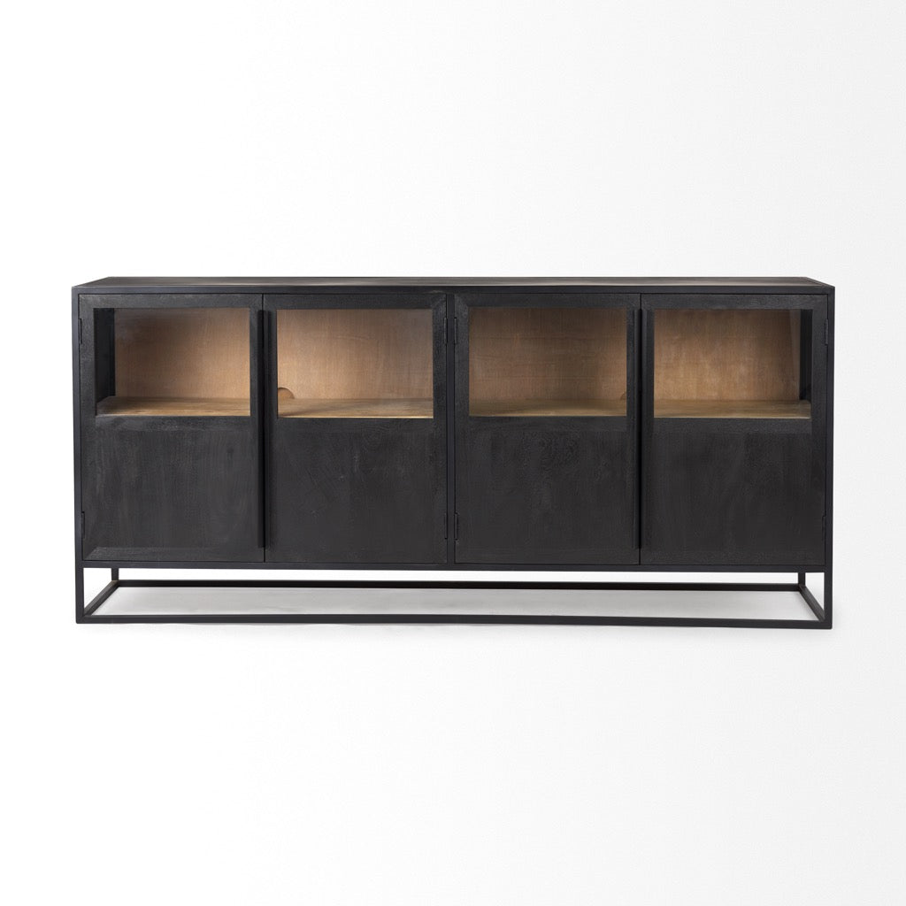 Bold, dark and chunky, just the way we like our Sloan Sideboard. This confident showpiece is perfect for themed interiors such as the modern farmhouse, industrial or urban loft look and feel. The cabinet itself is made from a sturdy black iron, which sits atop a sleek iron base. It is fronted by dark, solid mango wood doors. The doors feature a sleek grip and tempered glass that provide a window into the lighter solid wood interior. Once opened, the cabinet reveals a beautiful medium brown inner and a removable shelf.