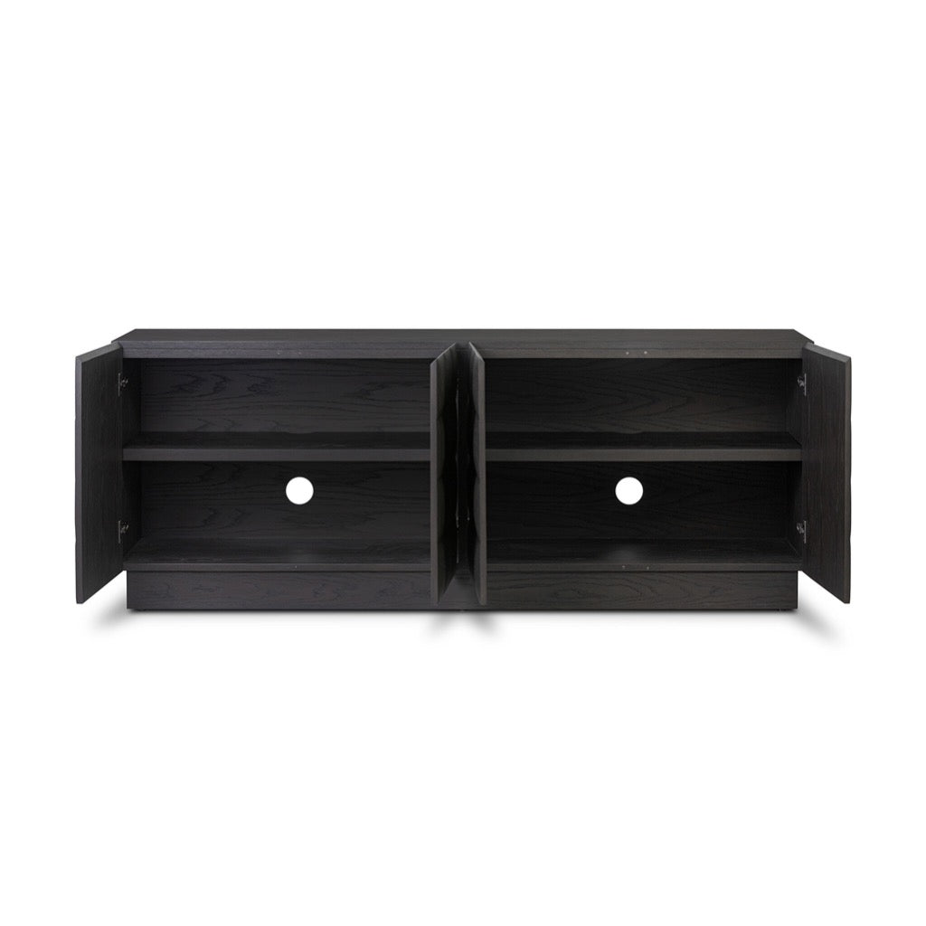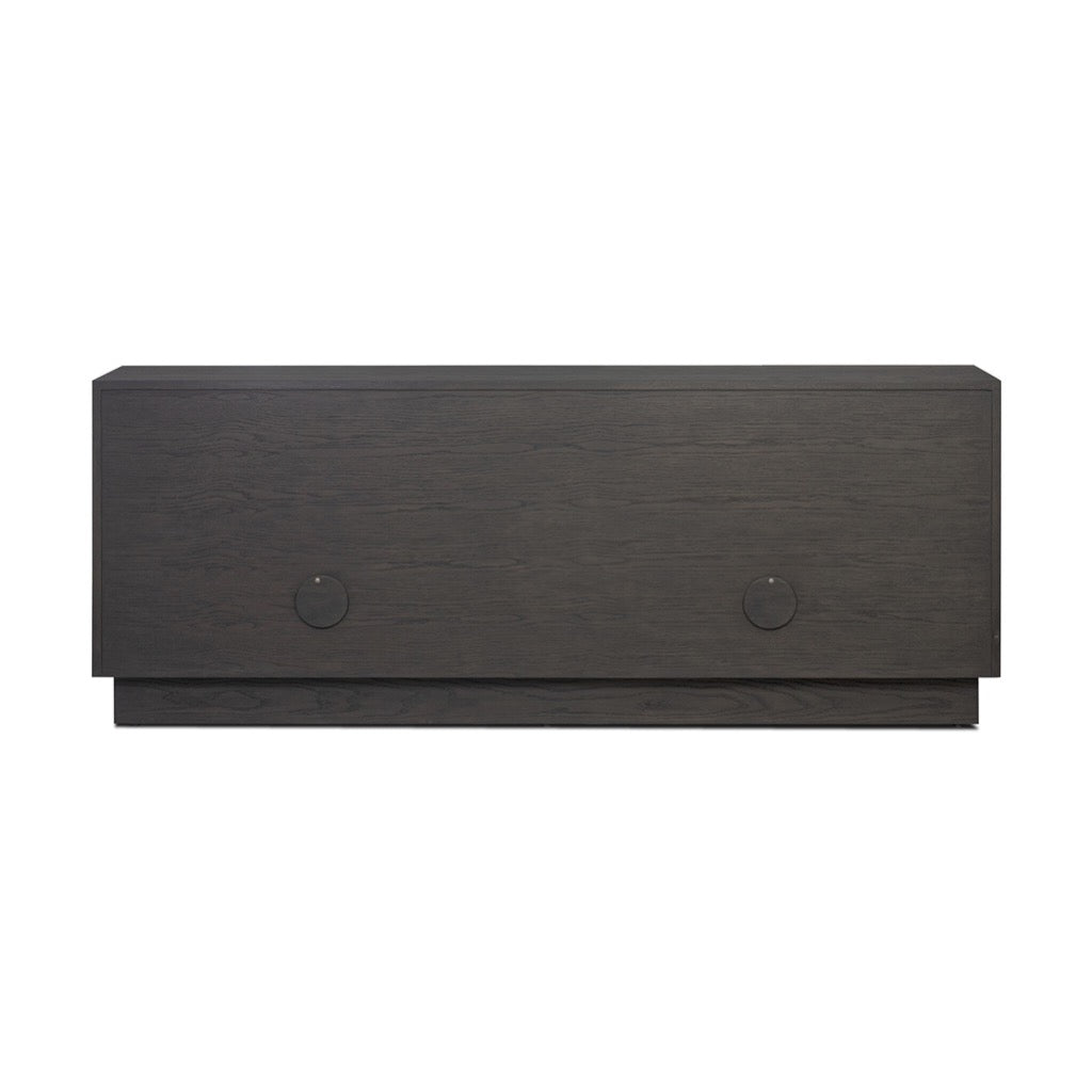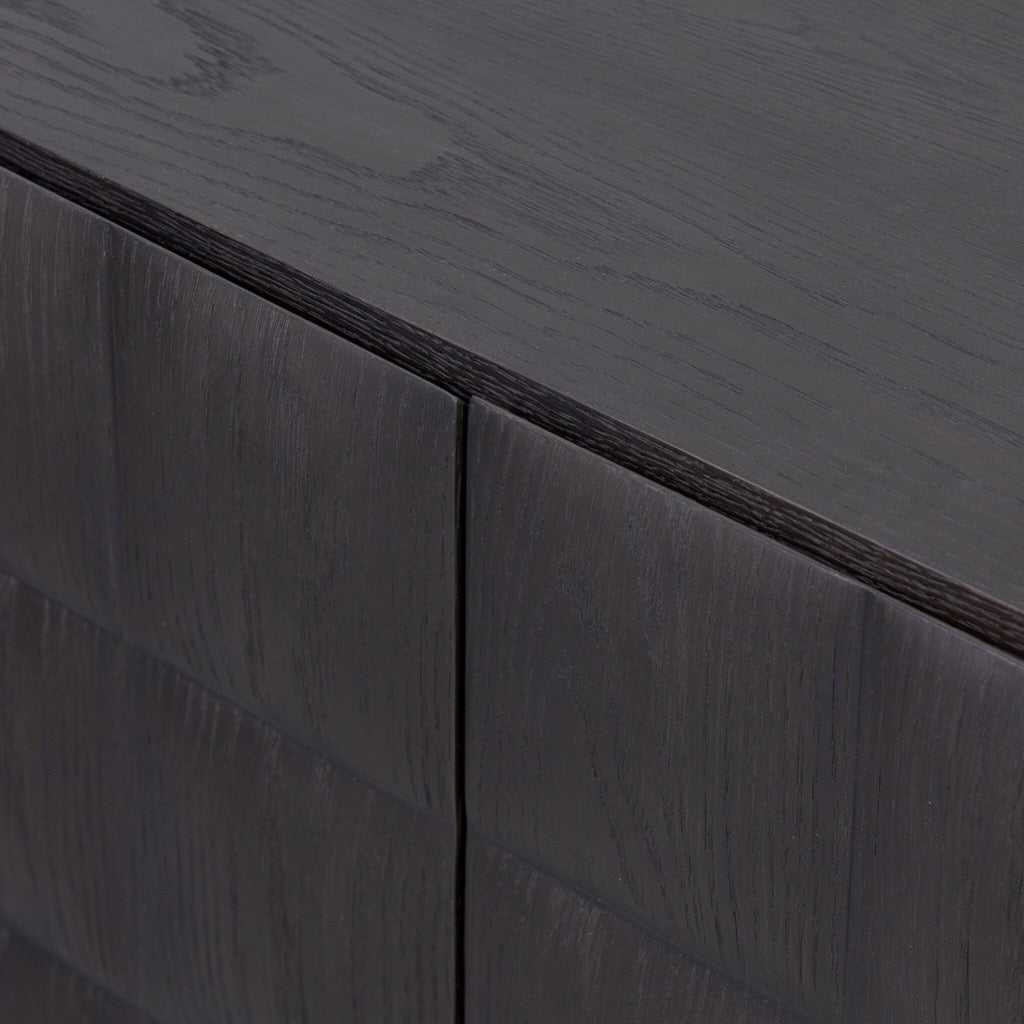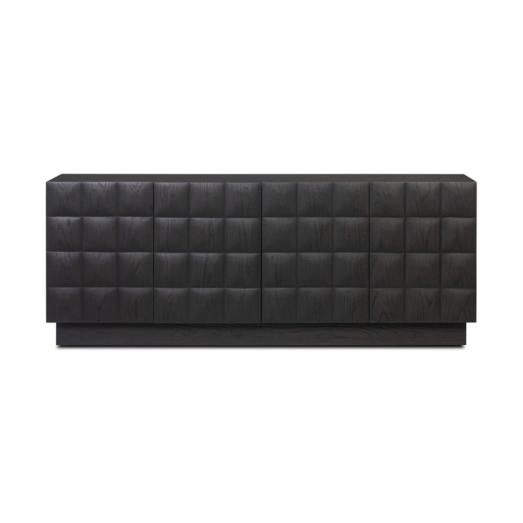 Store media essentials in a space-driven console of black-finished oak. CNC carving creates a voluminous grid pattern on the door fronts, while a simple waterfall design balances the whole look. Two rear cutouts keep cords out of sight.