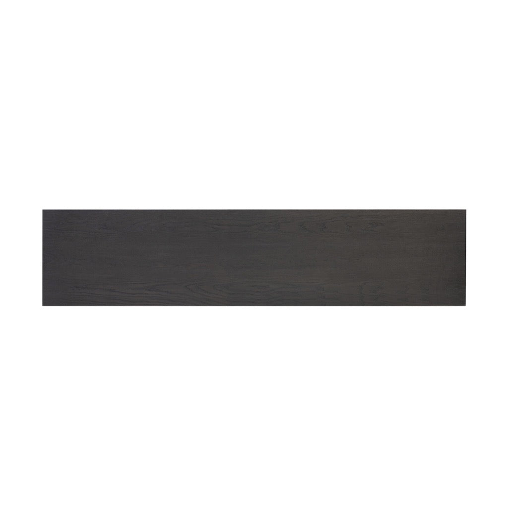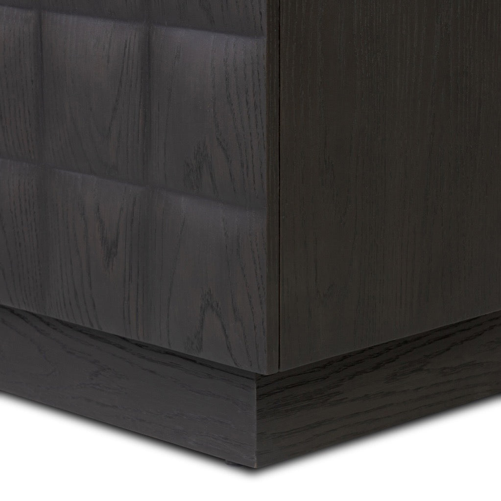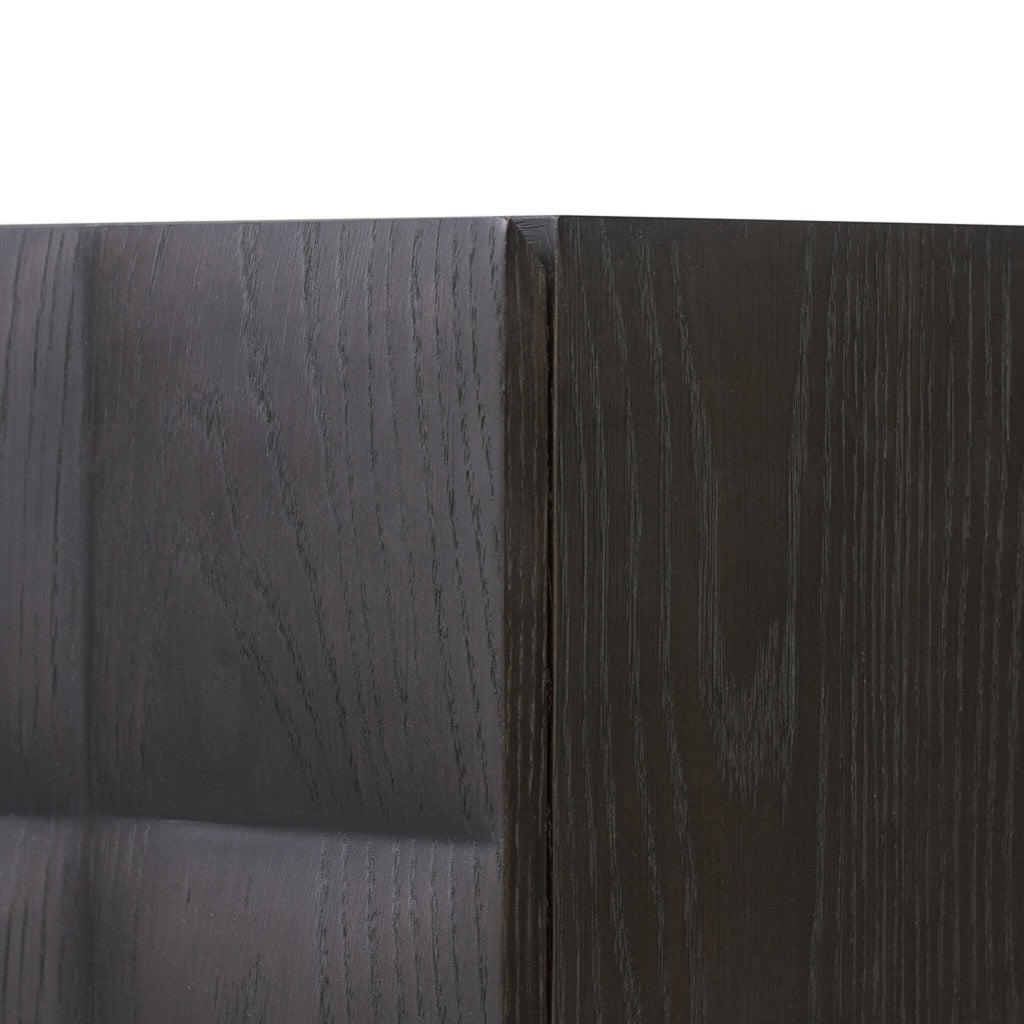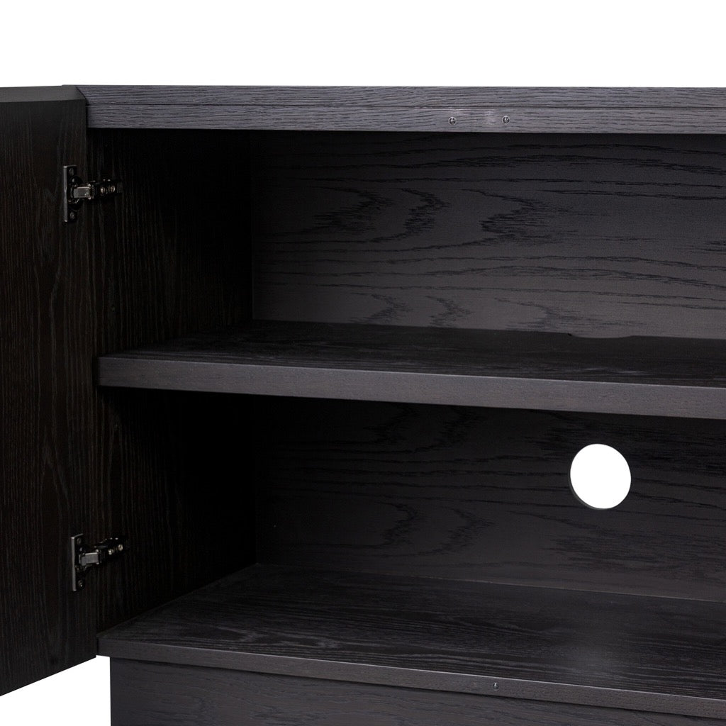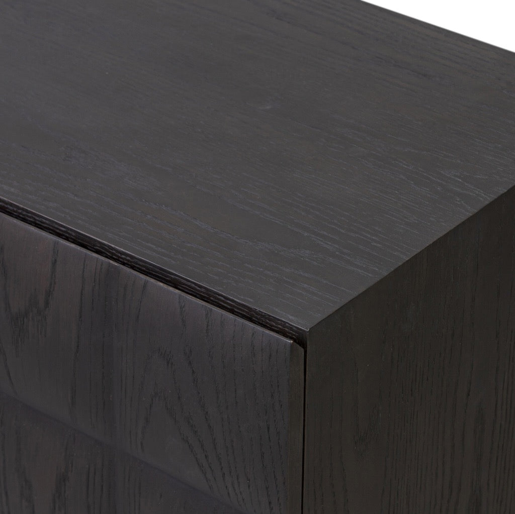 Store media essentials in a space-driven console of black-finished oak. CNC carving creates a voluminous grid pattern on the door fronts, while a simple waterfall design balances the whole look. Two rear cutouts keep cords out of sight.