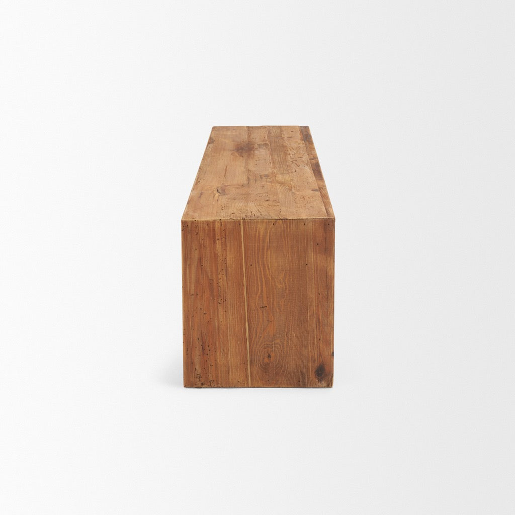 The Tahira Bench is constructed from natural, recycled pine, showcasing natural distressing and organic texture.