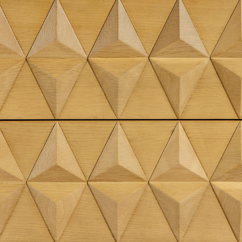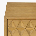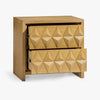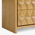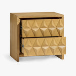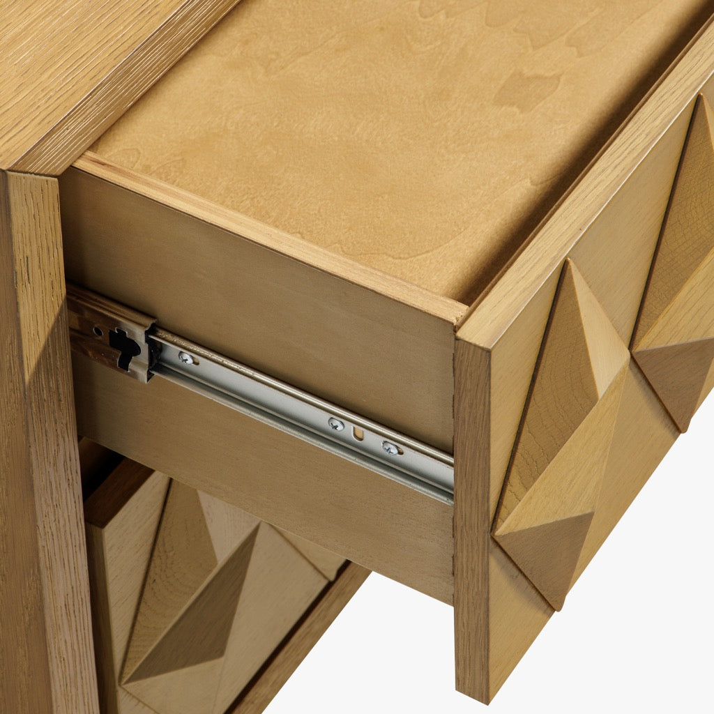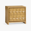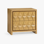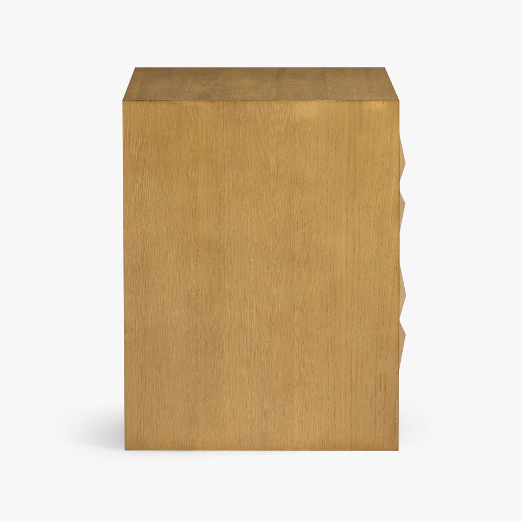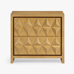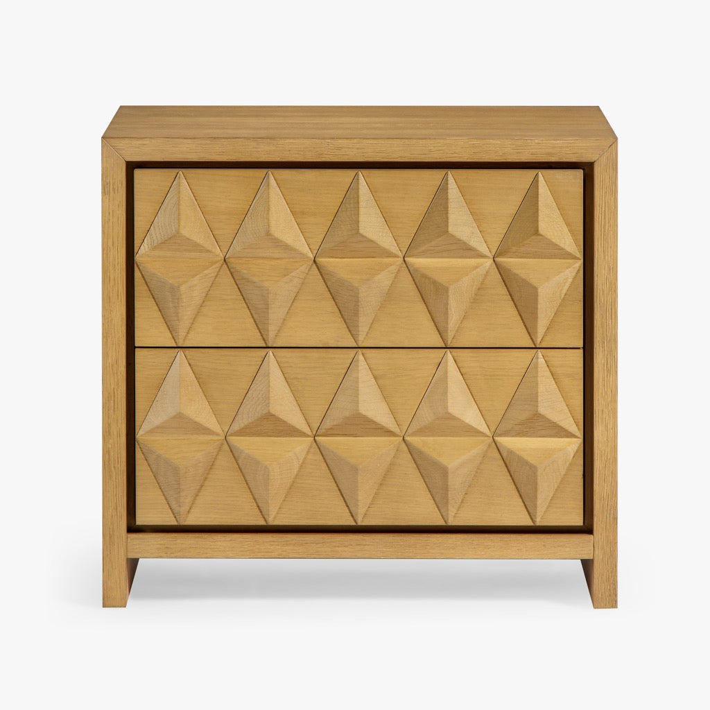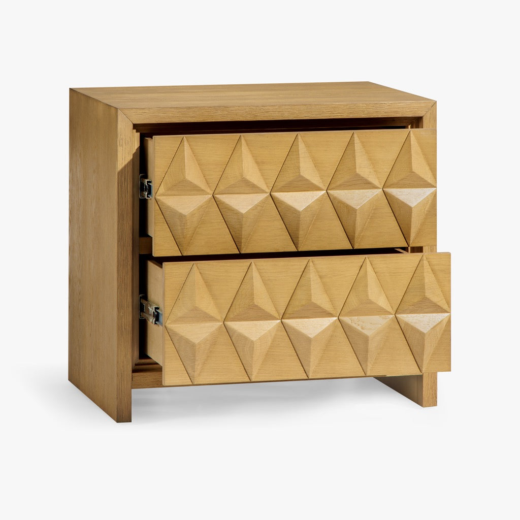 The Vivian Oak Nightstand is finished in a light natural tone, that enhances the natural grain and warmth of the wood. The drawer fronts feature a striking geometric pattern, adding texture and a modern design element to the clean-lined silhouette. Equipped with push-latch openings and soft-close drawer mechanisms, the drawers offer seamless functionality — no visible hardware, just effortless, quiet operation. Whether styled bedside or as an accent piece, this nightstand blends form and function with contemporary elegance.
