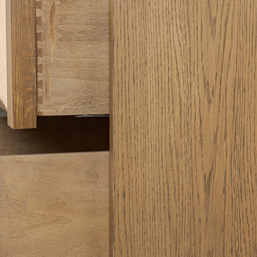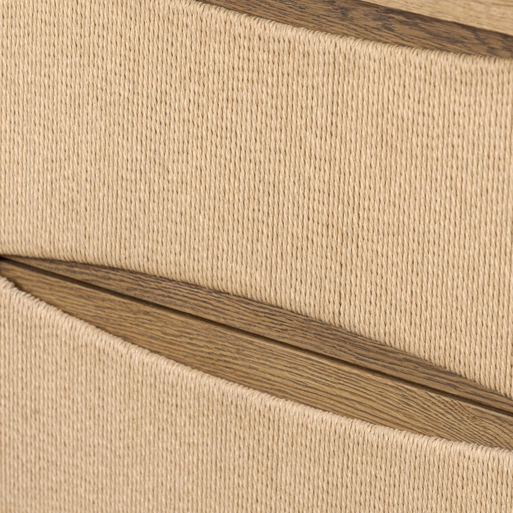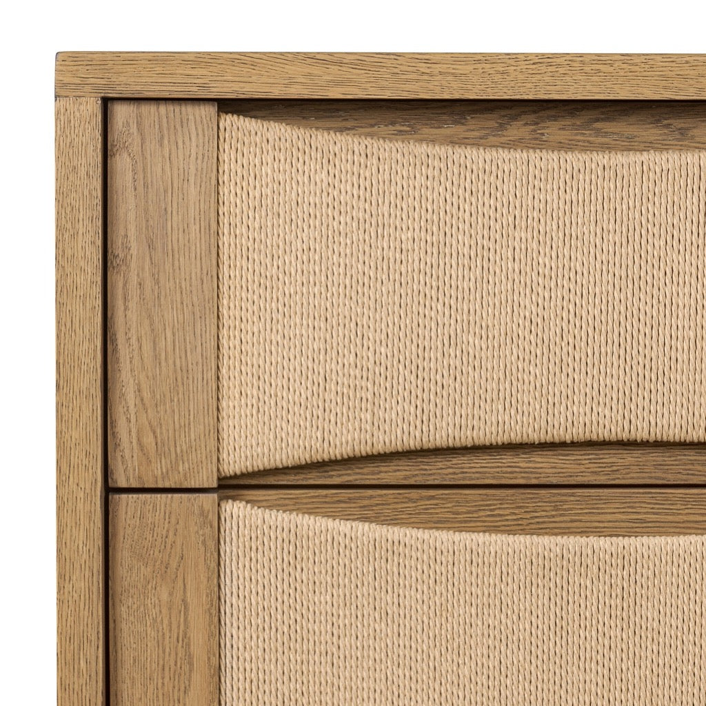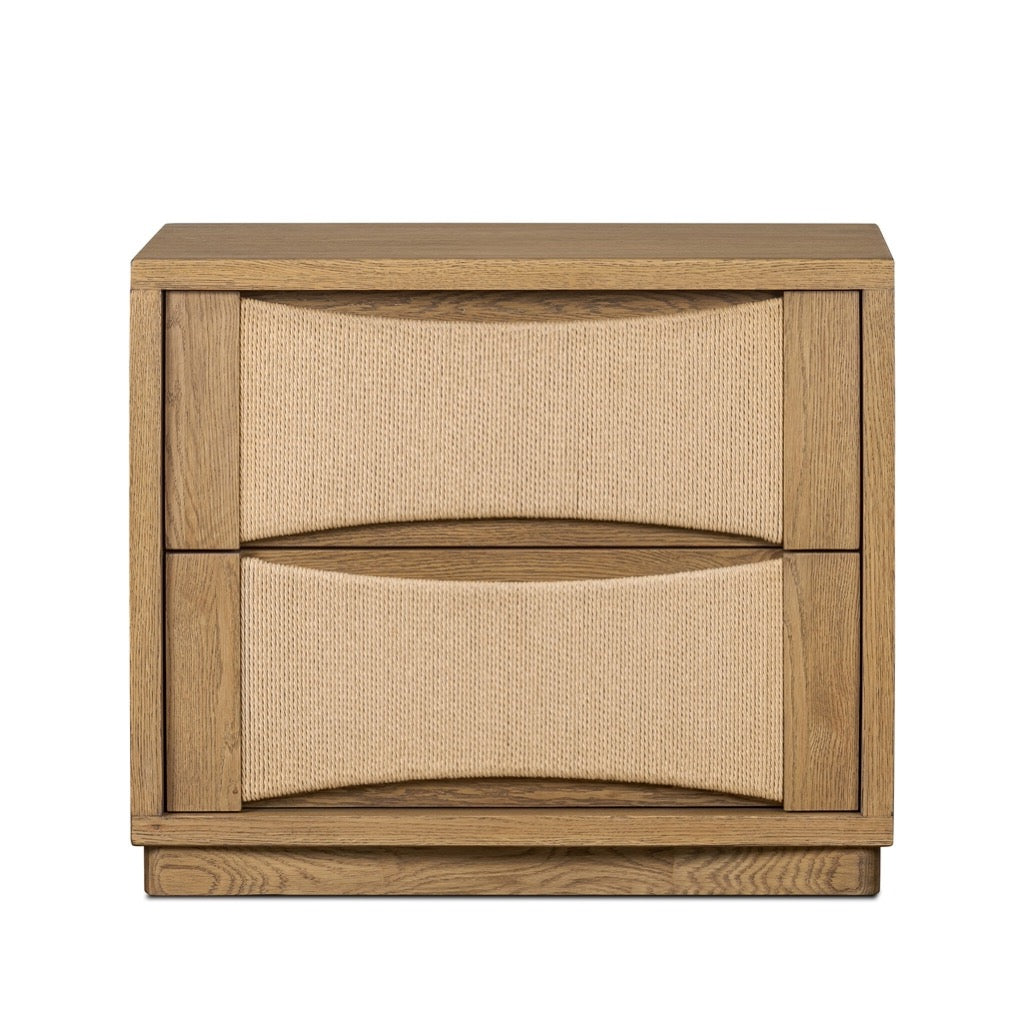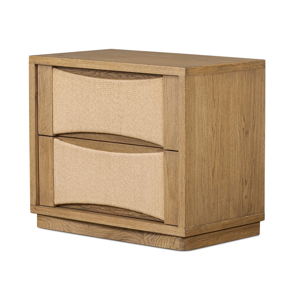 Mixed natural textures give this modern design its visual depth. Built from warm oak with woven paper cord drawers, the two-drawer nightstand has scooped panels and integrated hardware for a seamless look.