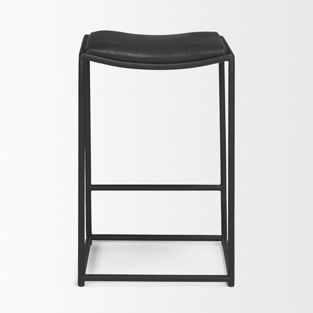 The Taniel Counter Stool is constructed from matte black iron tube metal with a contoured black full-grain leather wood seat.