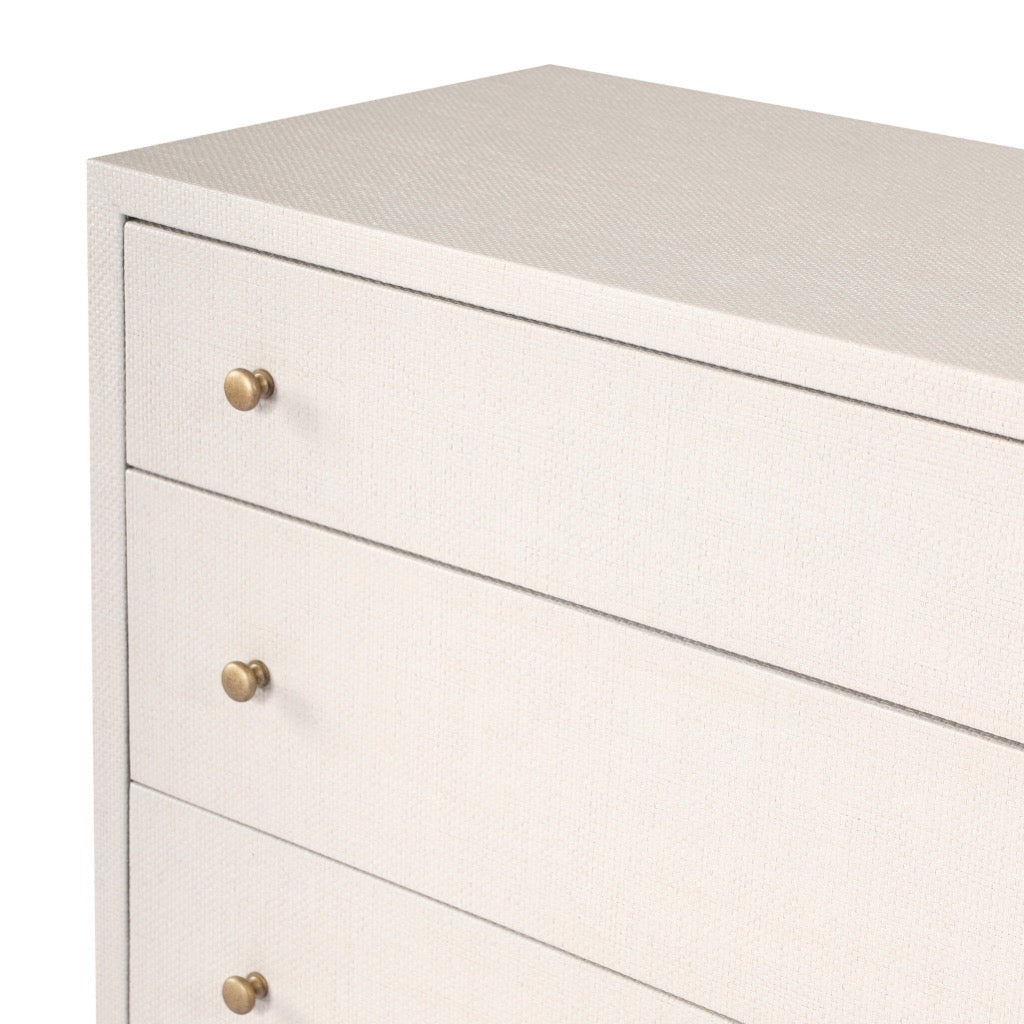 Woven ivory raffia offers a texture-driven take on bedroom storage. Antique brass-finished iron hardware adorns six spacious drawers, all supported by a solid mahogany base. This item has been modified to comply with the STURDY Act. See a full list of modified products and data changes in the “STURDY Act” file in the Downloads section below.