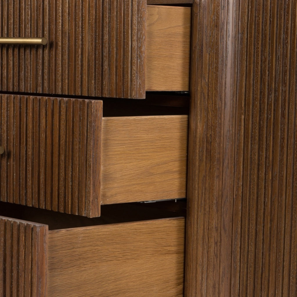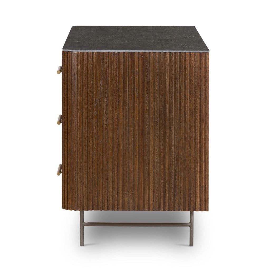 Rich with reeding for great texture and a linear look, brown-finished solid oak frames six spacious drawers with polished brass hardware and curved corners, while a bluestone top brings a beautifully complementary material mix to bedroom storage. White mineral lines and subtle color, texture and pattern variations are to be expected and speak to each stone's individual nature. This item has been modified to comply with the STURDY Act. See a full list of modified products and data changes in the “STURDY Act” file in the Downloads section below.