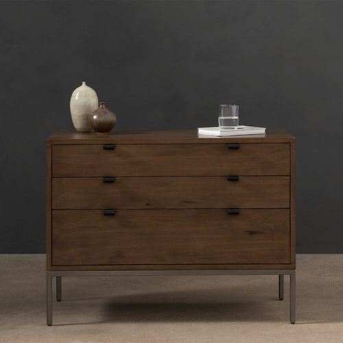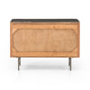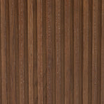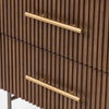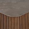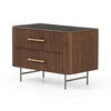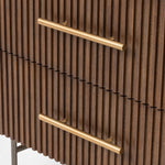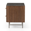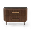 Rich with reeding for great texture and a linear look, brown-finished solid oak flaunts two roomy drawers with polished brass hardware and coolly curved corners, while a bluestone top brings a beautifully complementary material mix to bedroom storage. White mineral lines and subtle color, texture and pattern variations are to be expected and speak to each stone's individual nature.