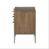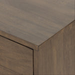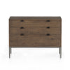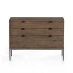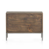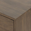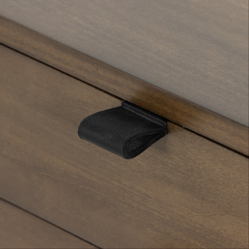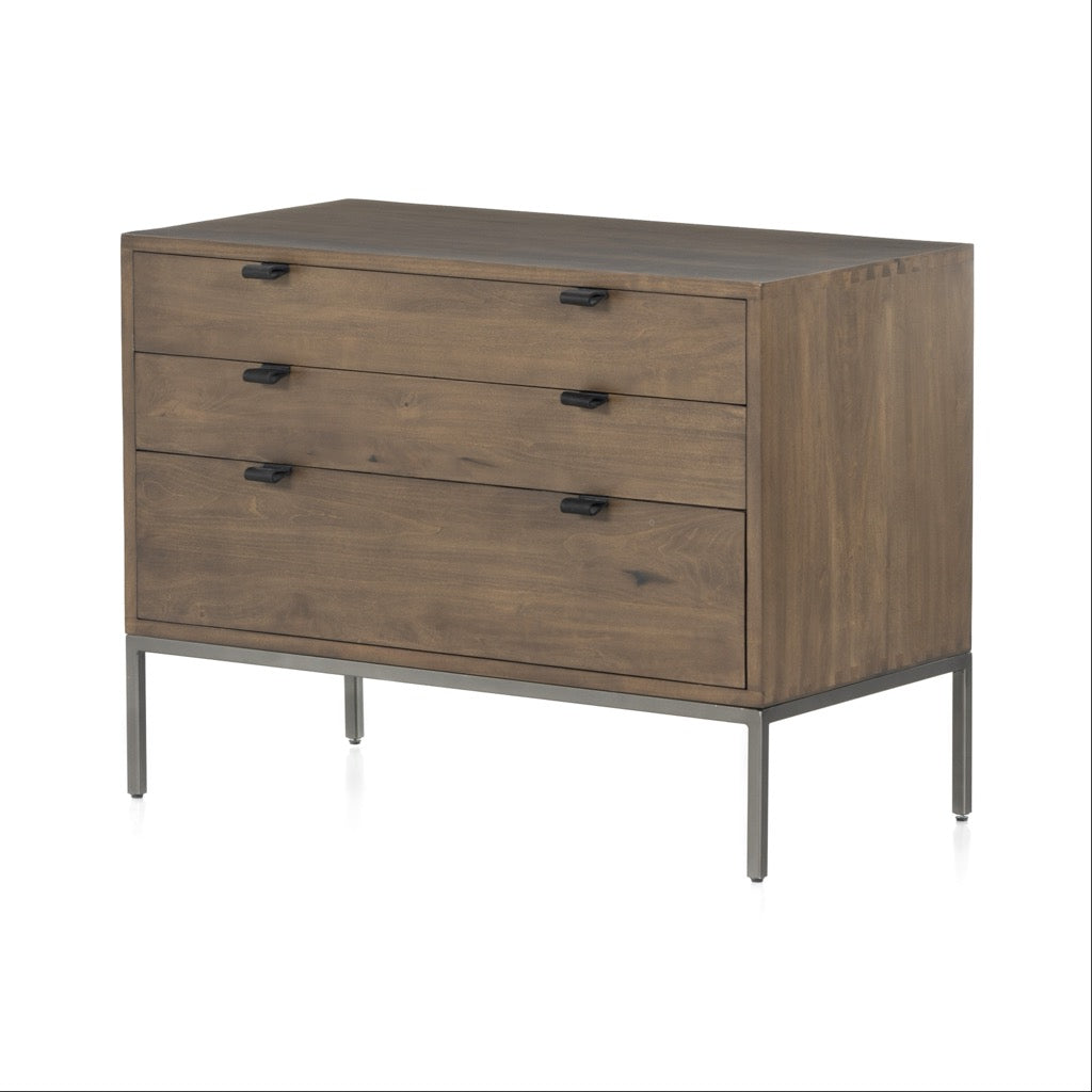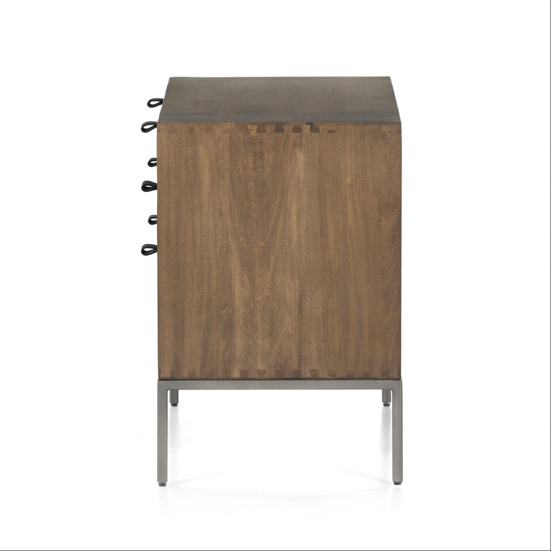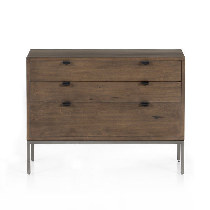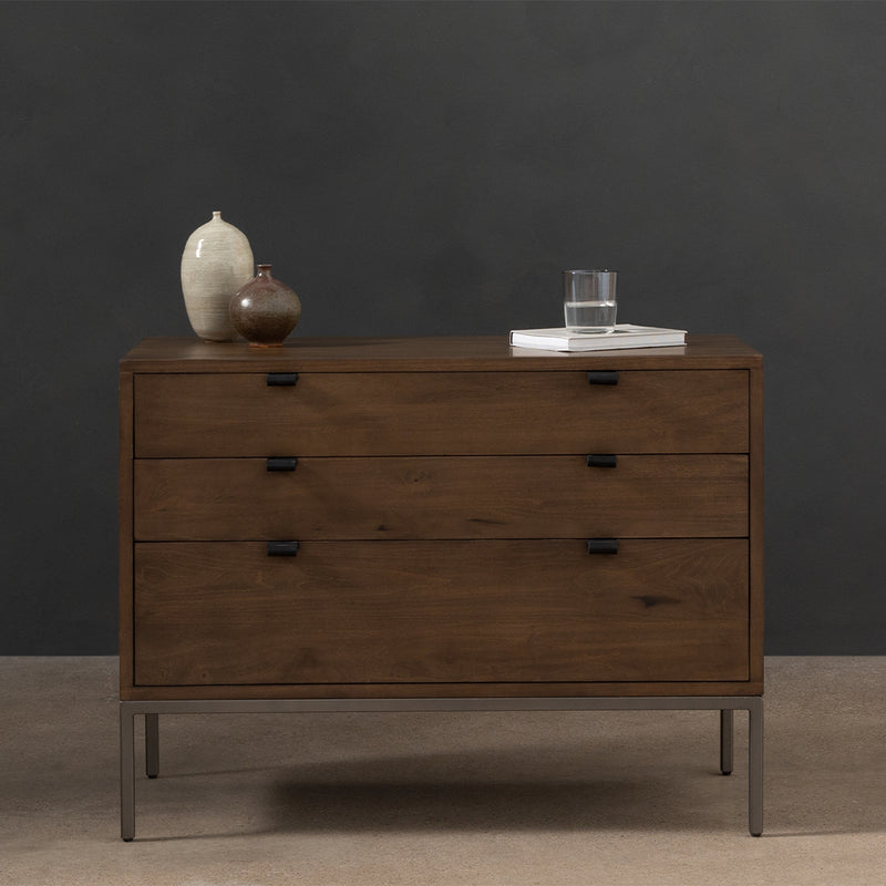 Simple style, inspired by midcentury décor. Made from auburn-finished poplar, a roomy three-drawer nightstand brings extra storage space to the bedside.