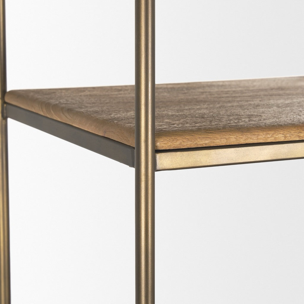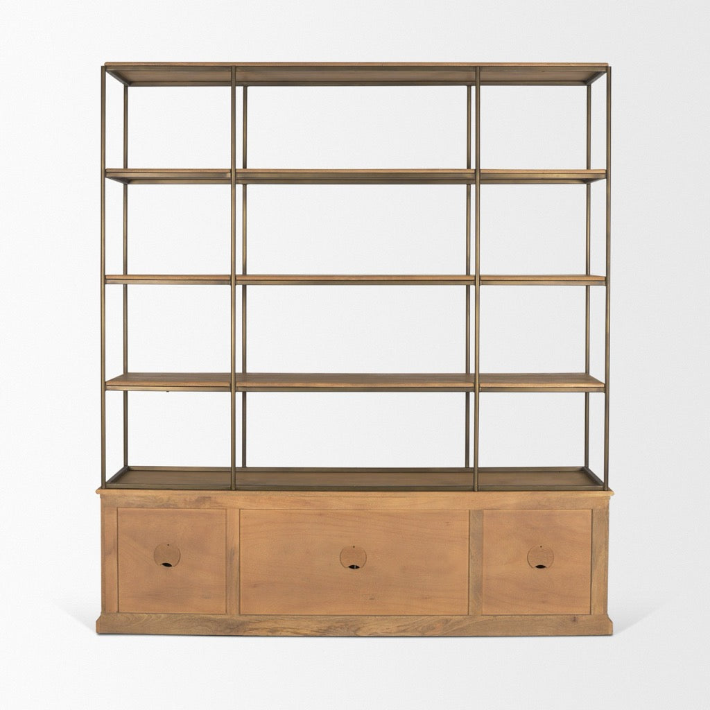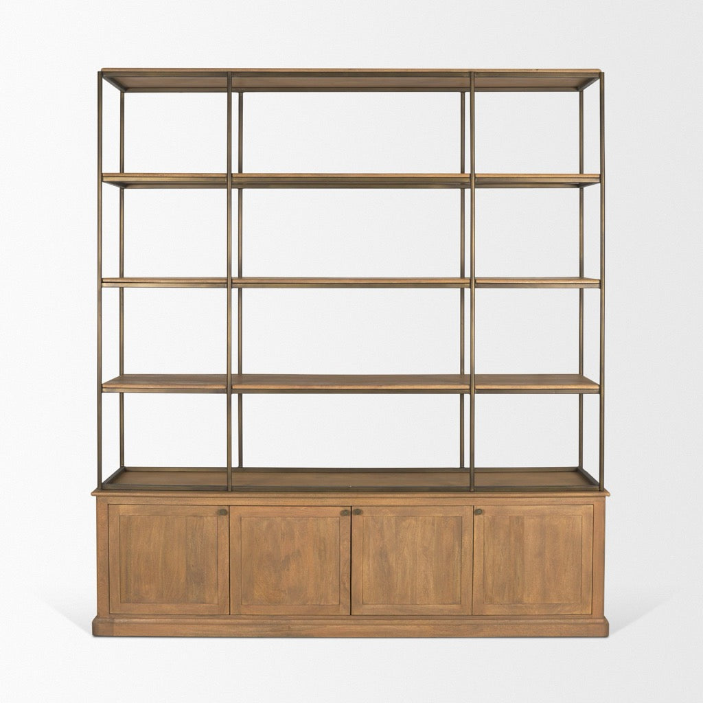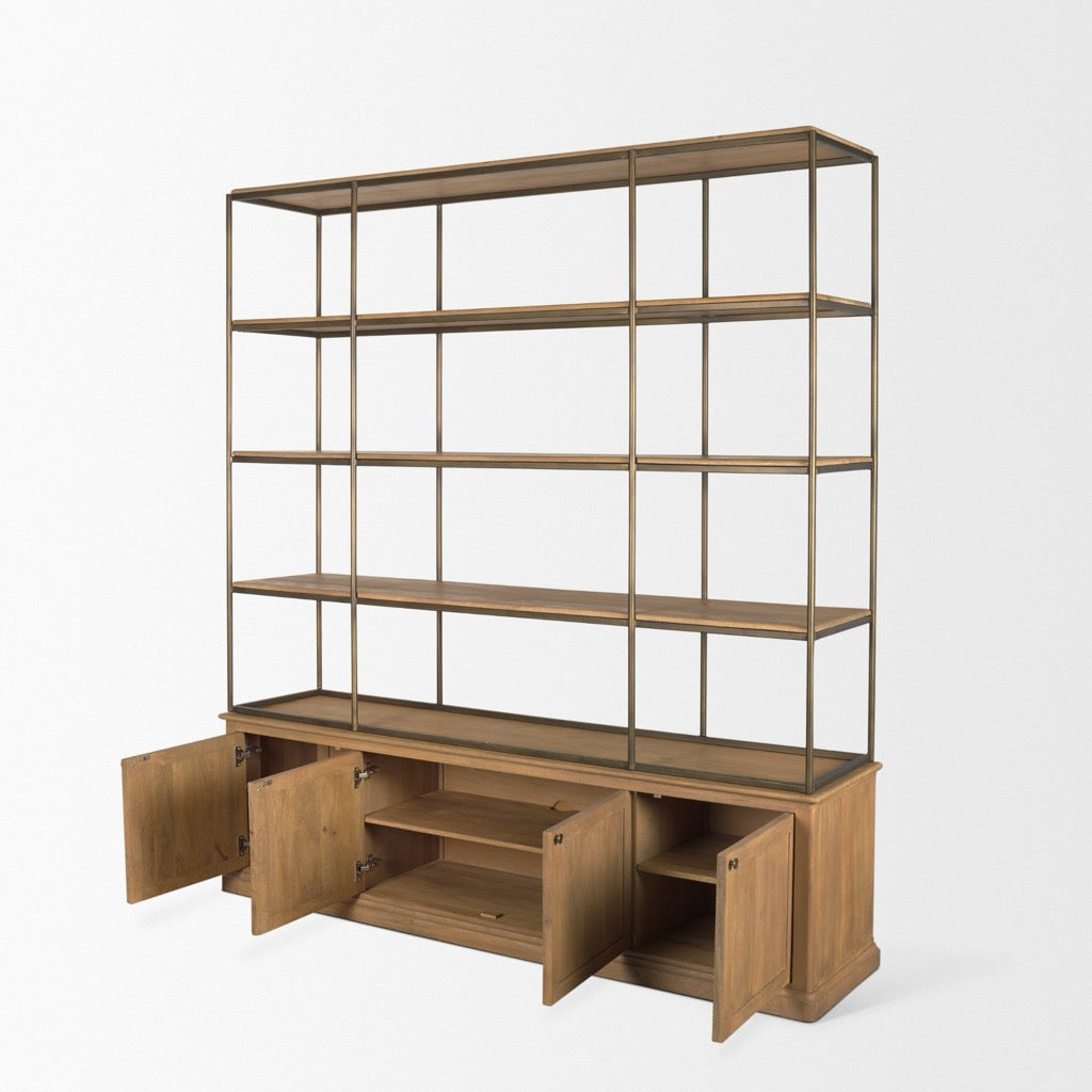 The Baron is a large-scale shelving unit constructed from solid mango wood with aged, patinaed brass iron metal accents, featuring three fixed open shelves, one removable shelf, and four cabinet doors.
