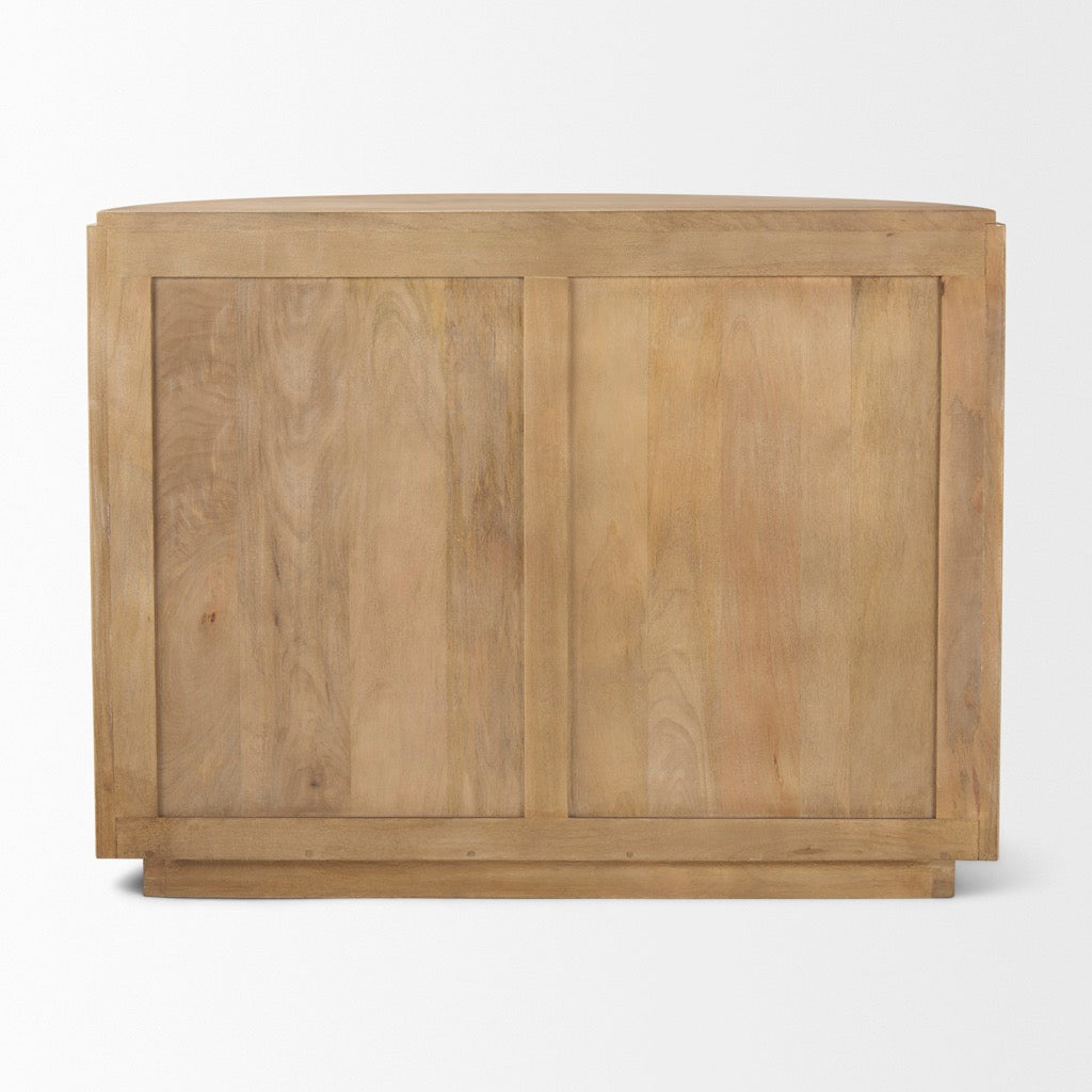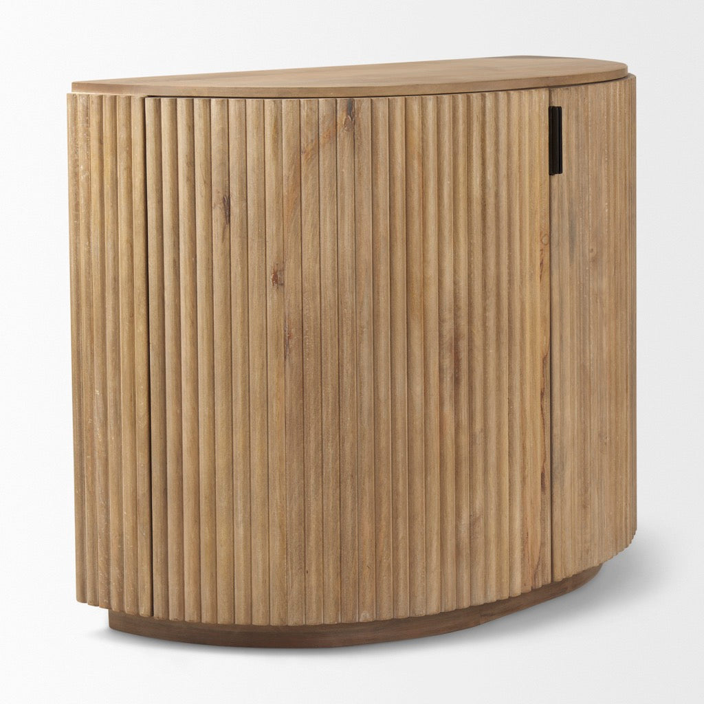 Terra Accent Cabinet in a light brown finish and has two black iron metal handles.