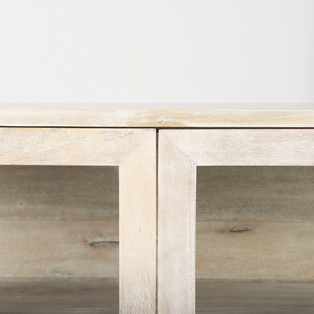 - Sturdy Without Being Bulky: The Arelius accent cabinet is beautifully crafted from solid Mango wood with two glass doors and glass side panels. It rests atop a sleek metal frame that reduces its visual bulk and enhances its airy aesthetic.