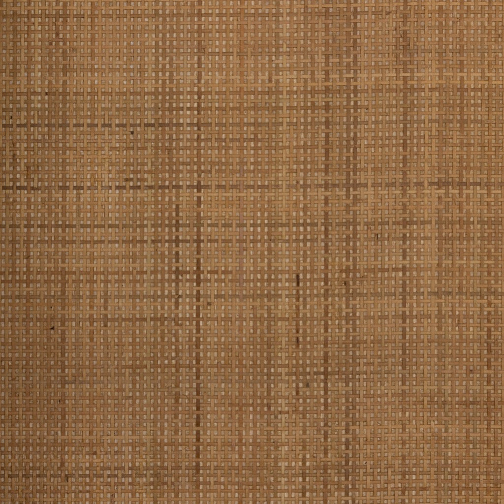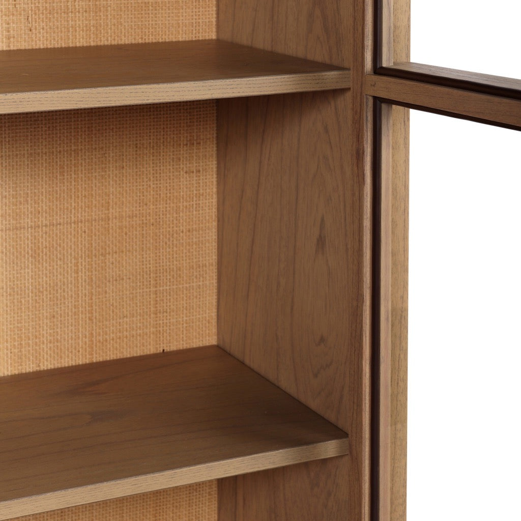 Burnished solid mindi forms a dramatic arch this glass-front cabinetry, with woven natural cane backing for a textural finishing touch.