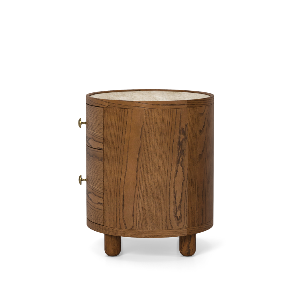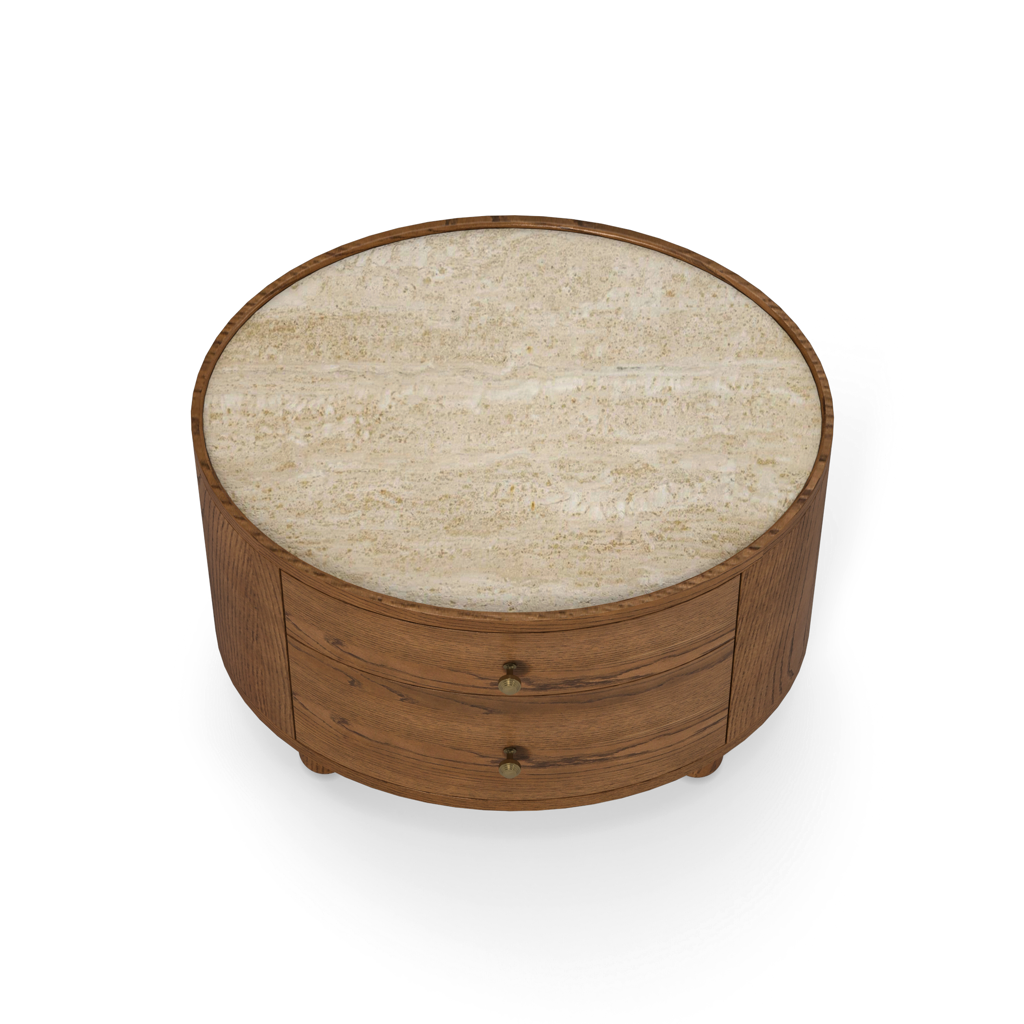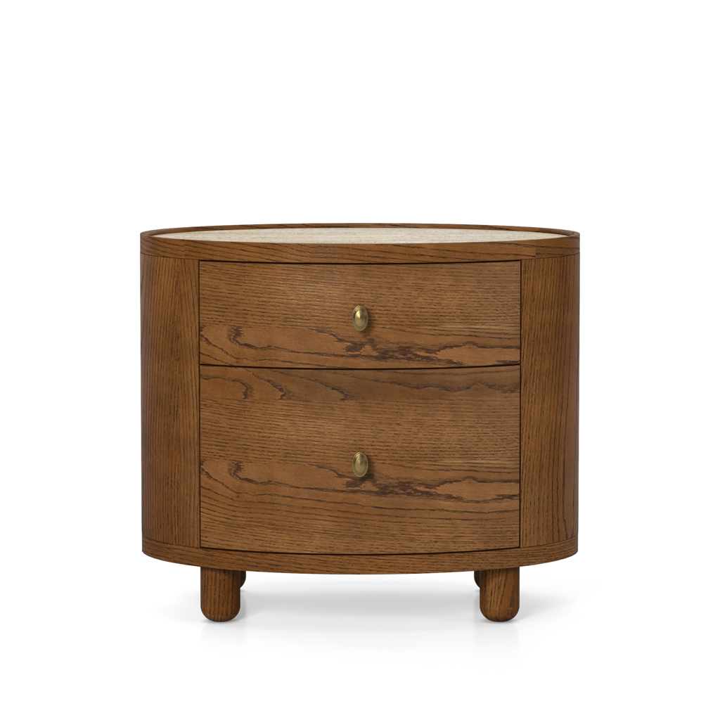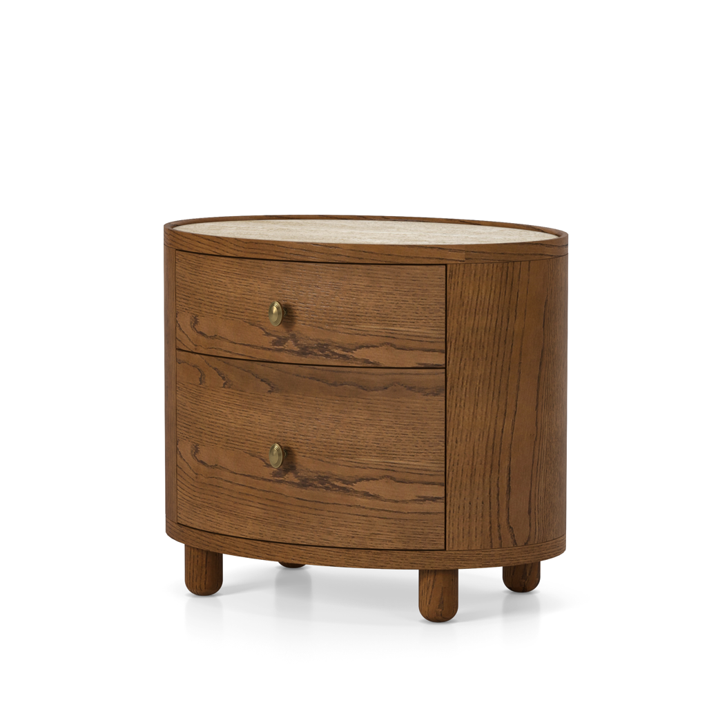 The Laguna end table has a refined, oval shape, and is crafted from solid oak and oak veneers, paired with a travertine top and antique bronze finish hardware. The bun feet add a playful accent to the design. Available in either a light oak or a walnut finish, the Laguna table is perfect for use in a living room, or as a pair of nightstands in a bedroom.