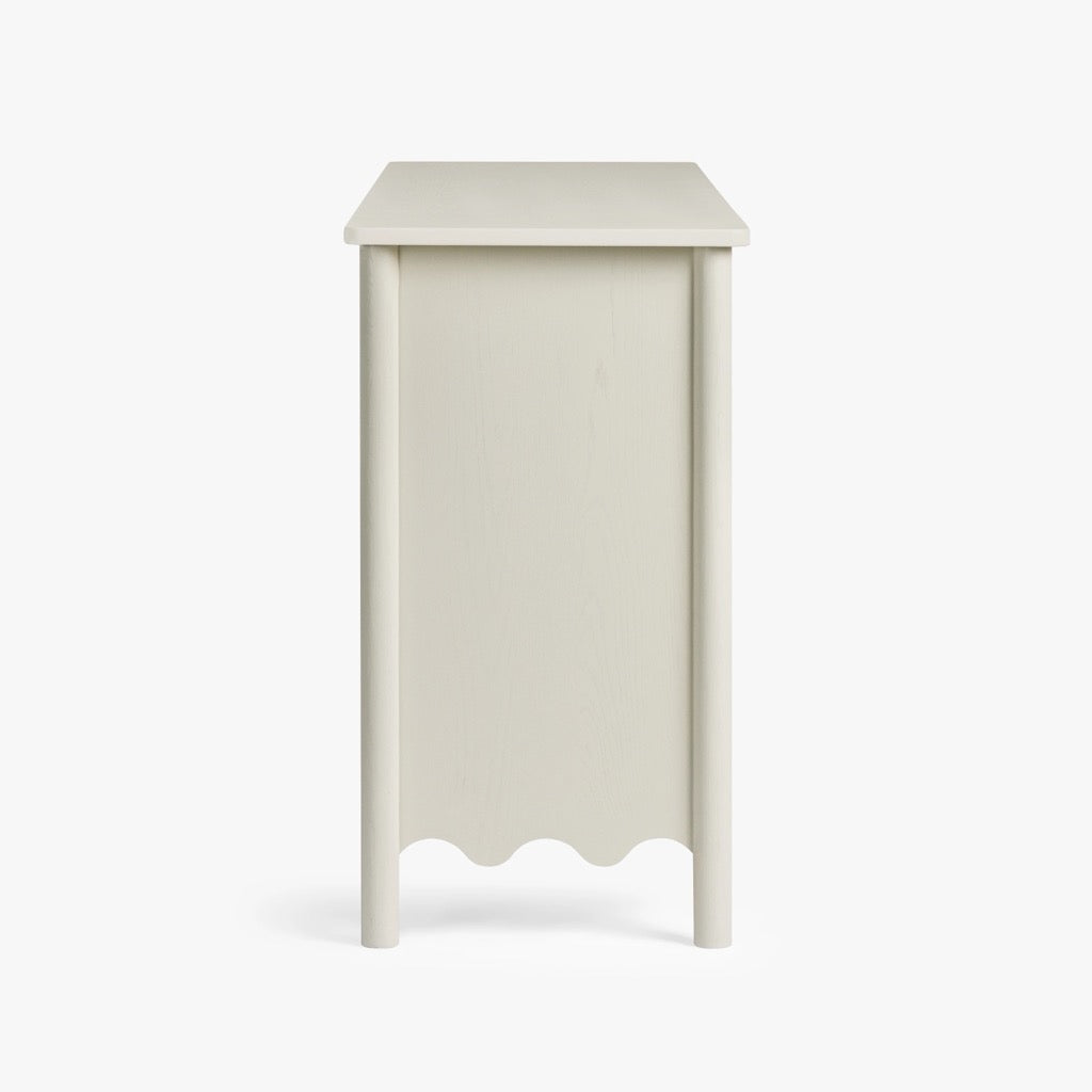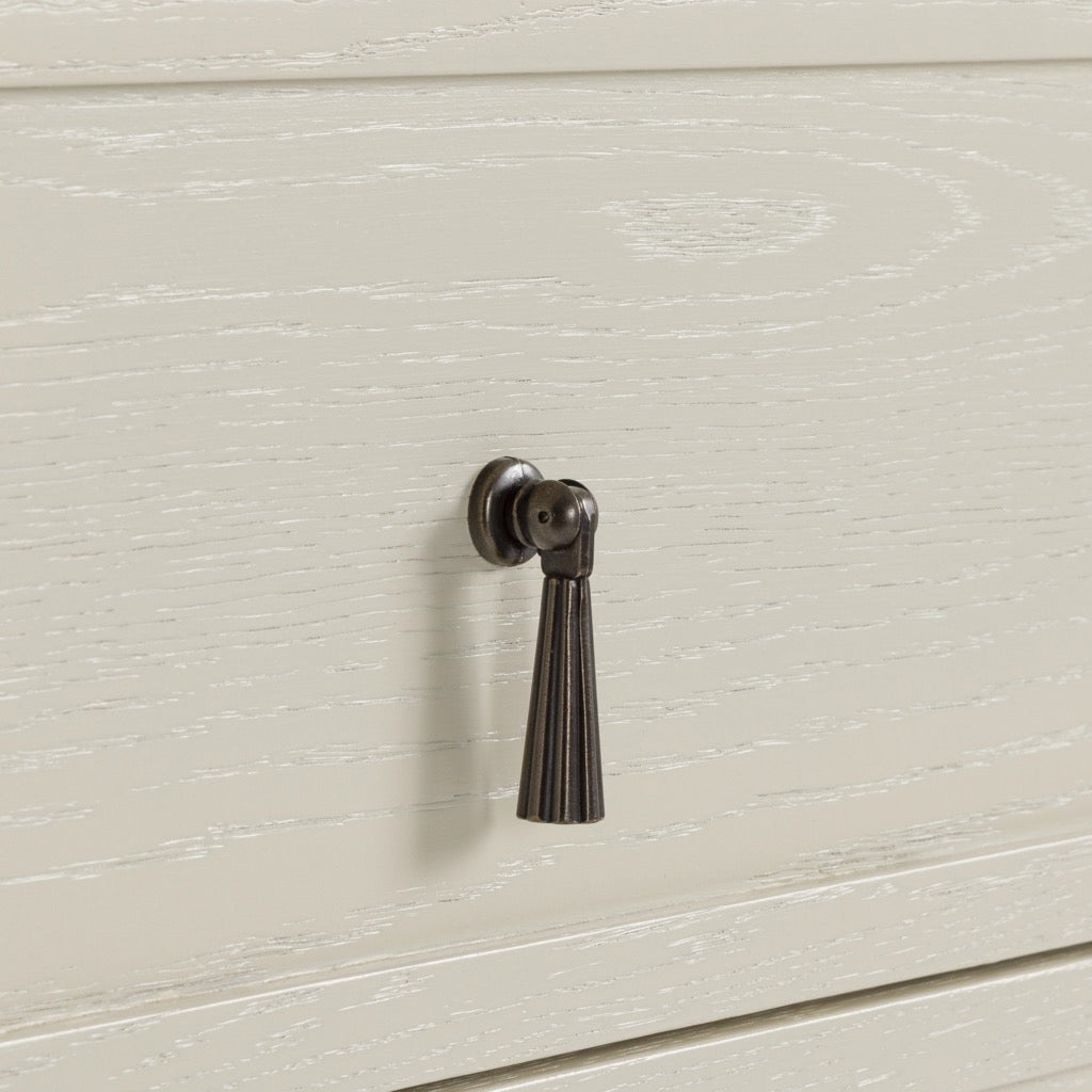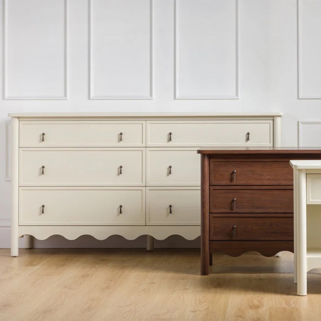 The Onda 6-drawer dresser is crafted from solid oak and oak veneers, featuring six drawers fitted with soft-close runners for smooth, silent operation. Its design is traditional yet refined, with beveled drawer fronts and distinctive metal drop-pull handles that lend a touch of vintage charm. A scalloped apron at the base introduces a playful twist to the classic silhouette, while the dark brown finish beautifully enhances the natural grain of the oak wood.