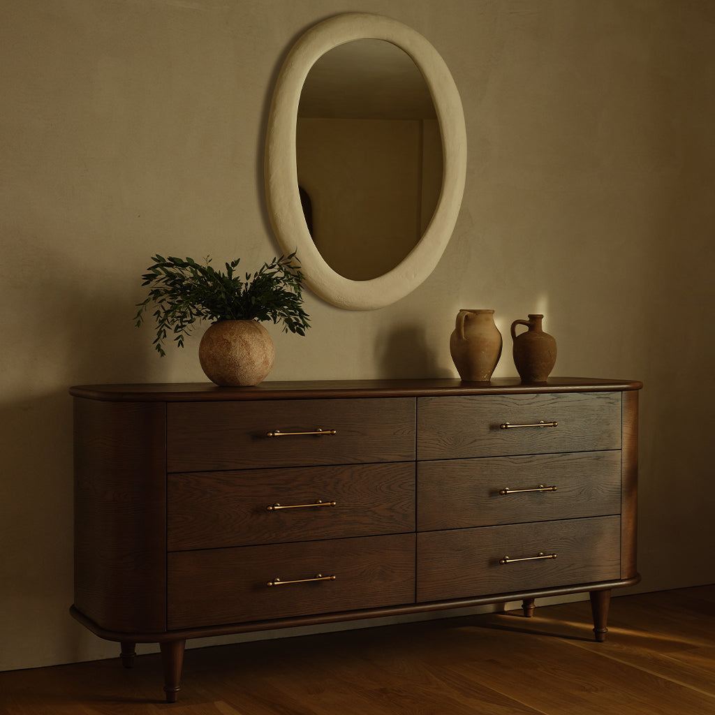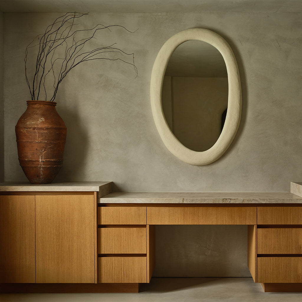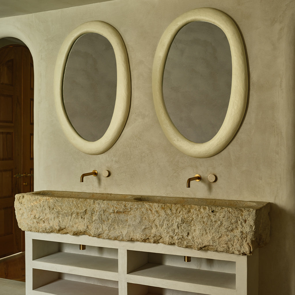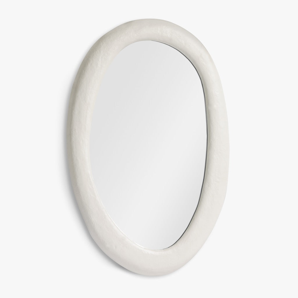 The Simone mirror is an organic shaped oval mirror with a subtle plaster finish. The mirror would work in a powder room, main bath or foyer setting.