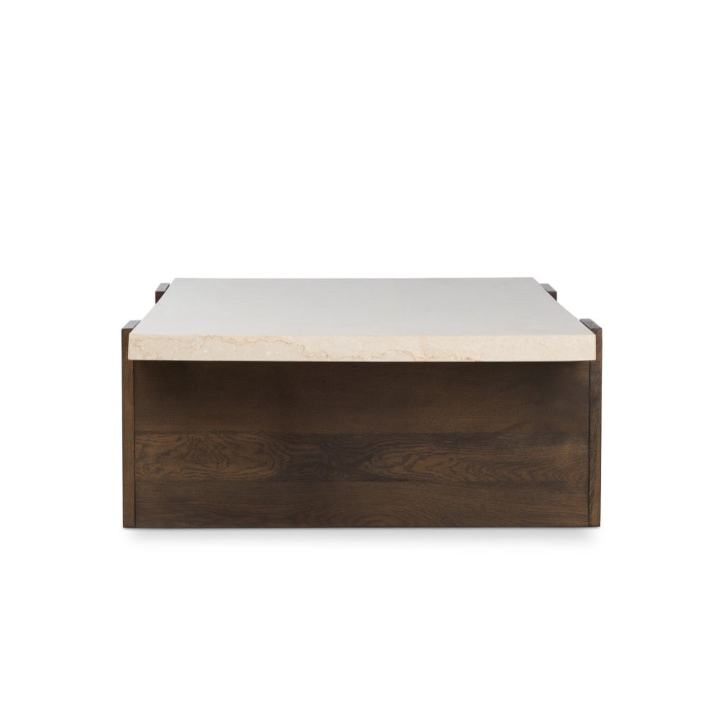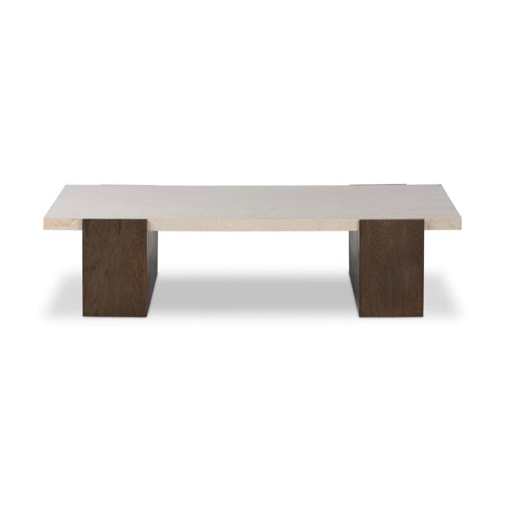 Clean lines and mixed materials pair up to craft an eye-catching coffee table. A wide cradle base of tobacco-finished oak supports a rectangular top of cream marble with beautiful natural veining.