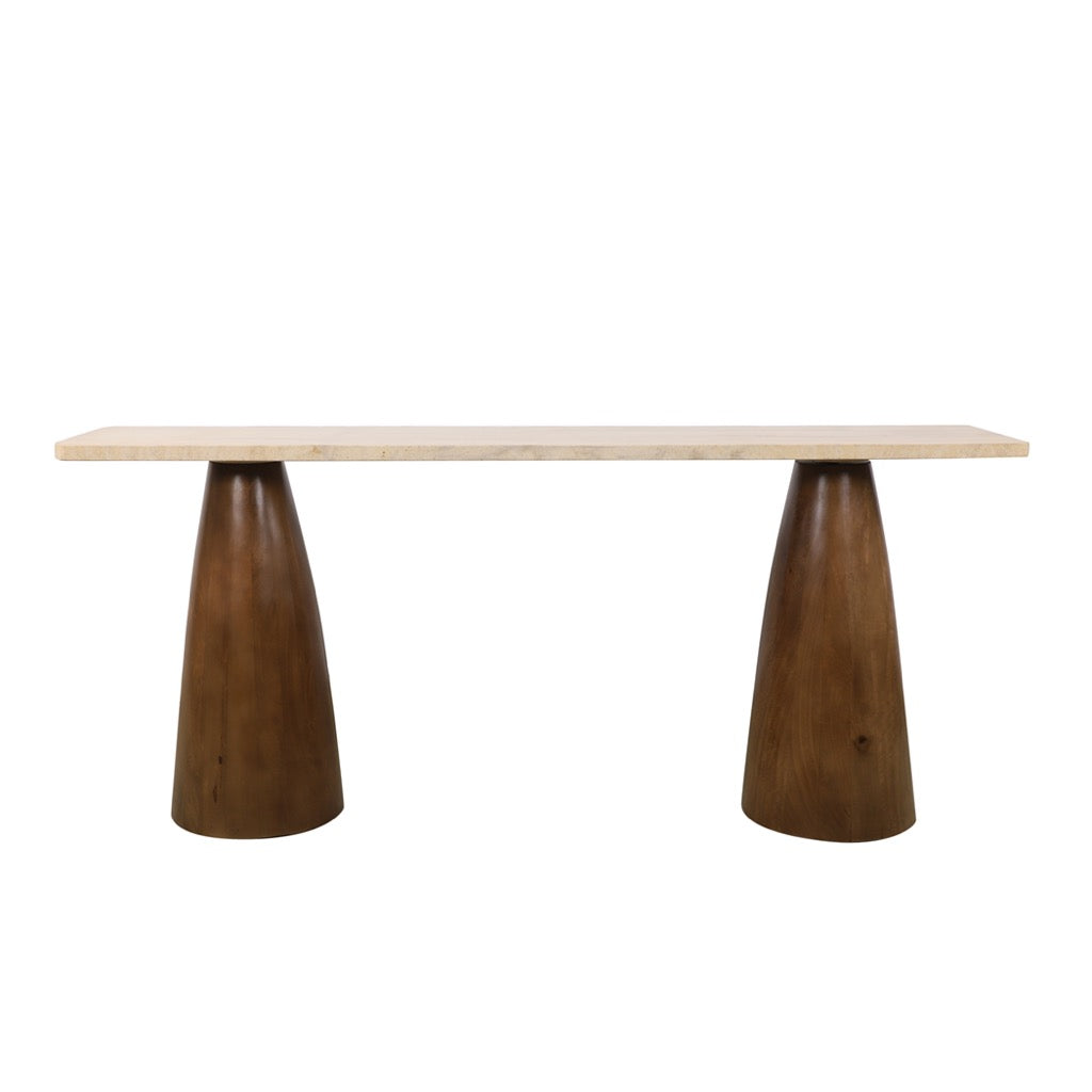 The Breton Console Table features a striking travertine top paired with a sleek mango wood base in a rich walnut brown finish. With its clean lines and elegant design, this piece adds a touch of sophistication to any entryway, living room, or hallway. The durable travertine surface and warm wood finish make it both functional and visually stunning, perfect for display or storage.