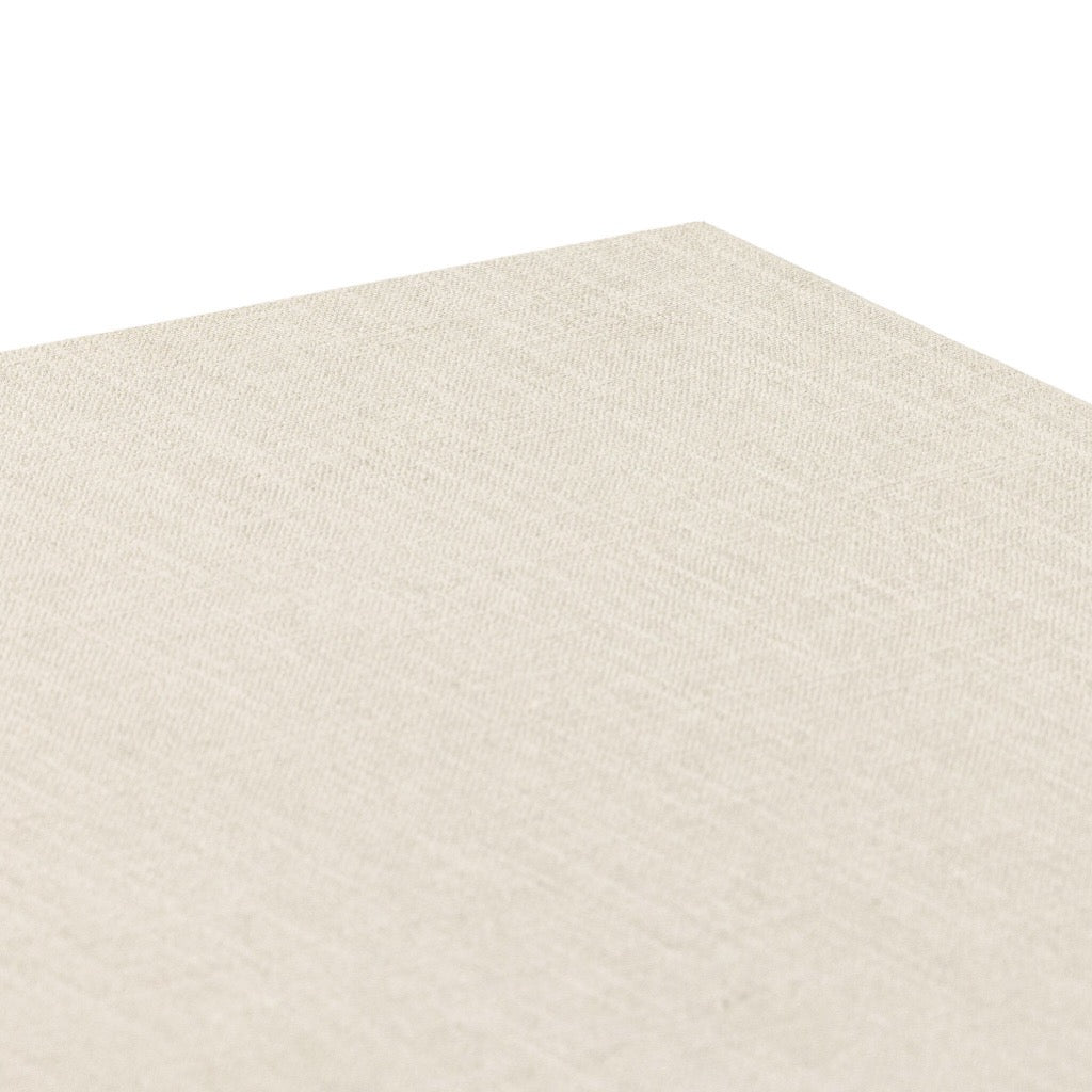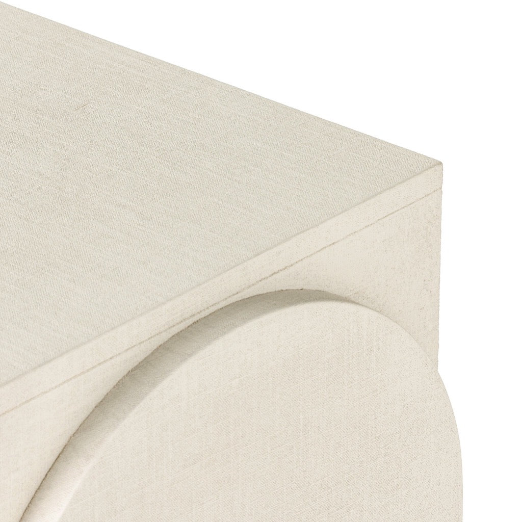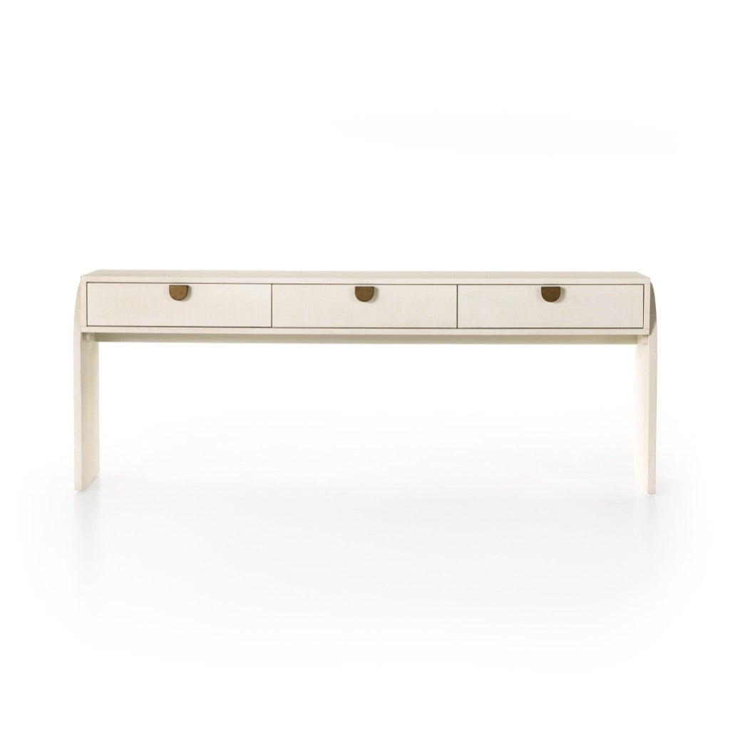 Talk about novelty. Made from painted linen in a light ivory, arched legs soften otherwise clean, modern shaping. Three drawers bring bonus storage space to the living or media room, while half-moon iron hardware adds a hint of art deco style.