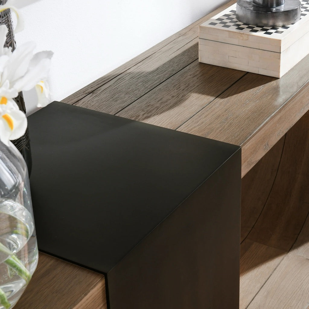 Breathtaking and full of verve, this console table features iron and oak in a dynamic design. Weathered black iron appears to harness the organic energy of the piece, making this piece a bold focal point for your space.