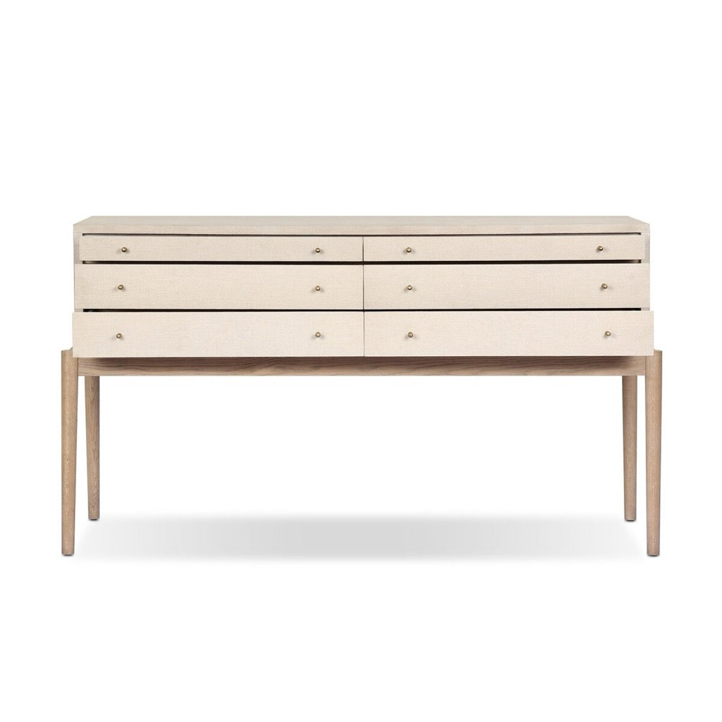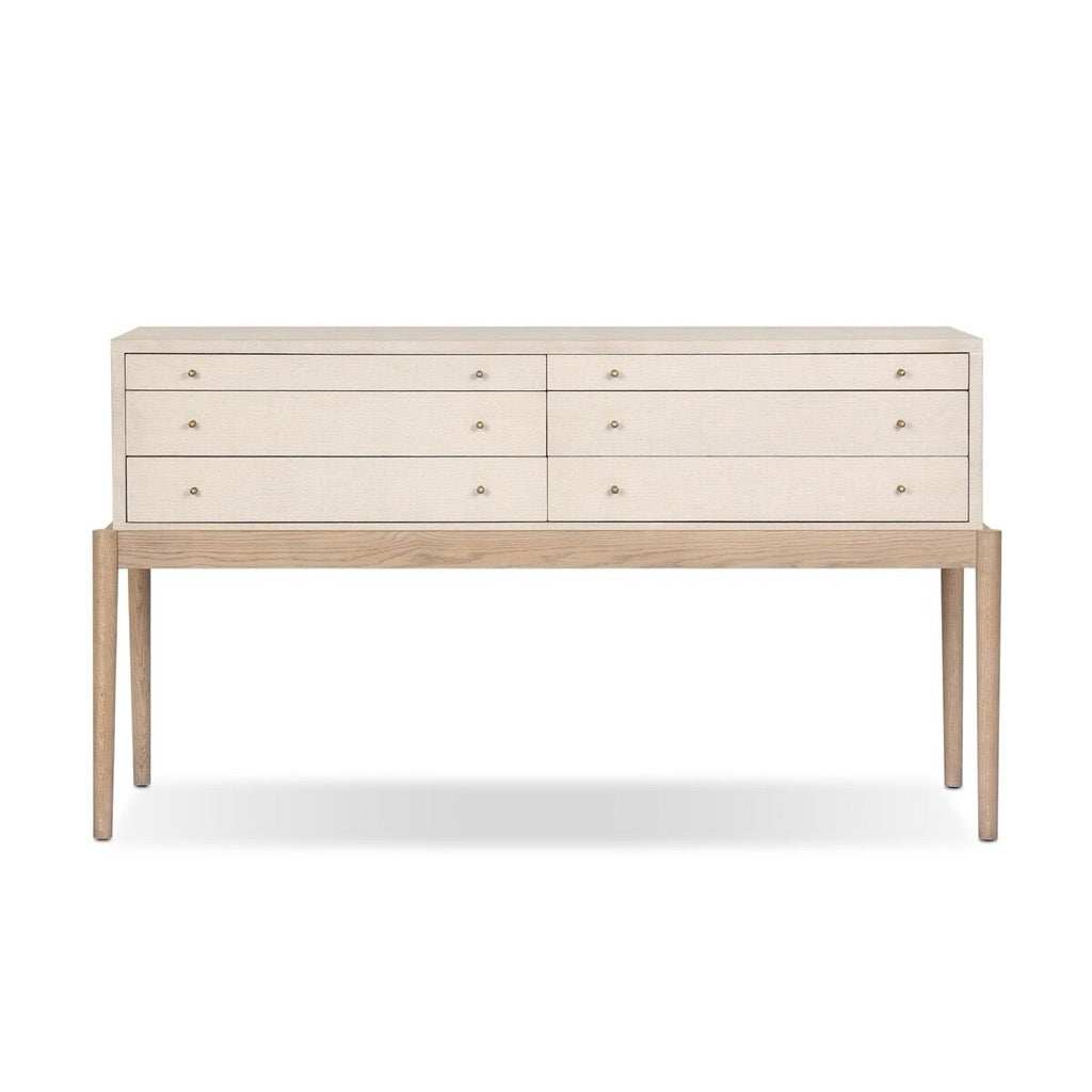 A soft statement console table with ample storage, inspired by a dresser silhouette. The elevated case is wrapped in painted linen and sits atop an oak base for a light and airy look.