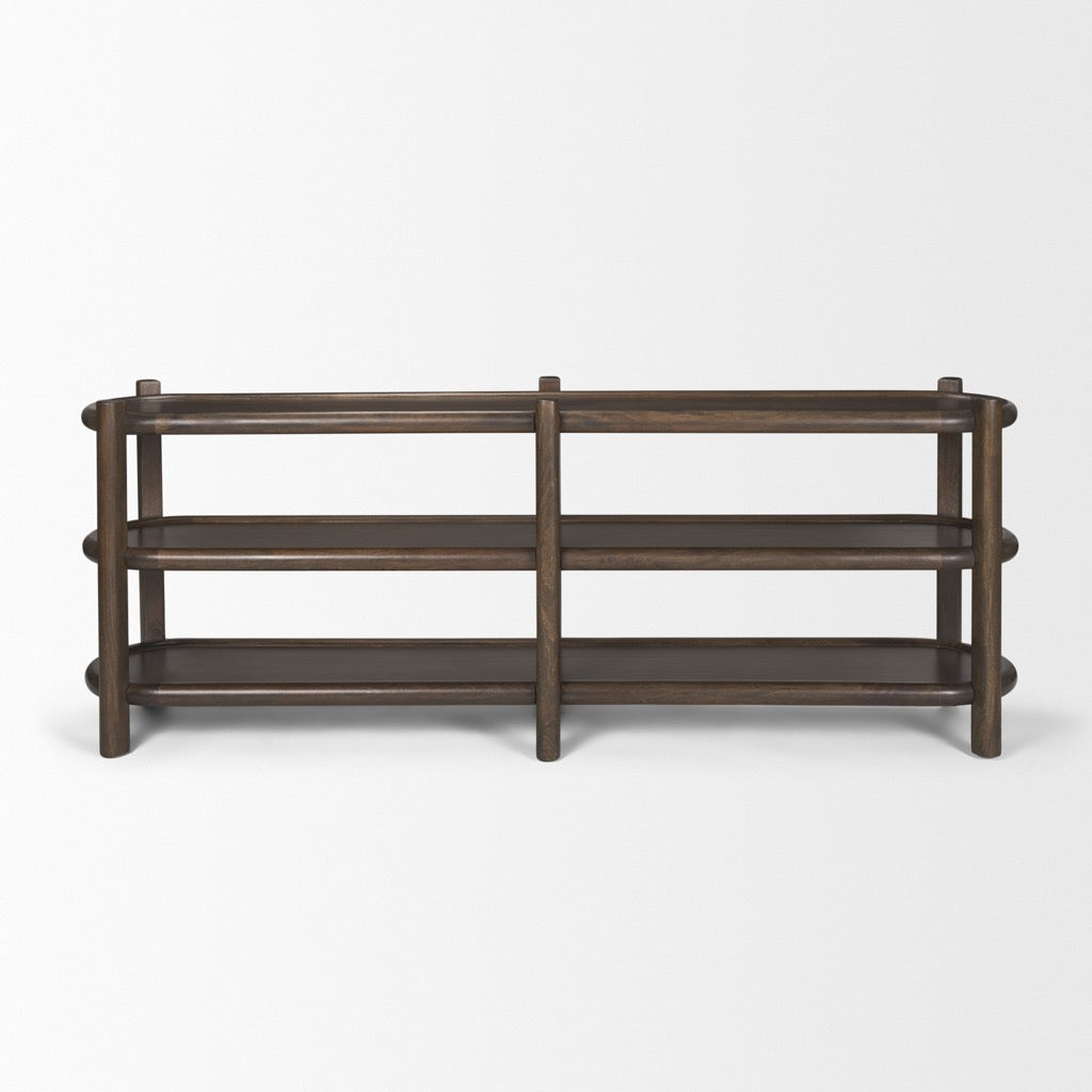 The Romi Console Table is crafted from dark brown mango wood with an oval tabletop and two bottom shelves for additional storage.