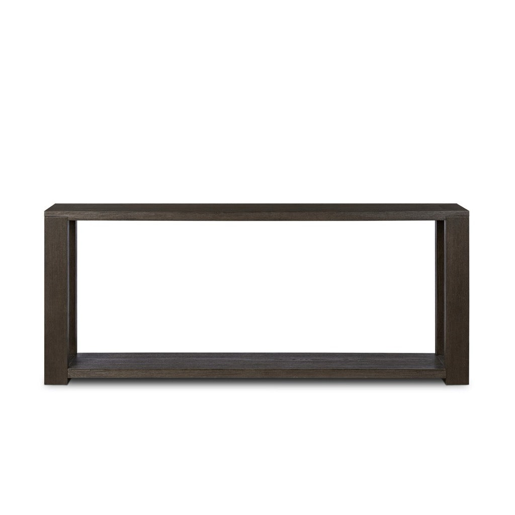 Made from oak veneer finished in a dark anthracite, a long, open-style console table brings a rich, clean look to your living or media room. Lower shelving brings bonus storage and display of media, favorite books and more.