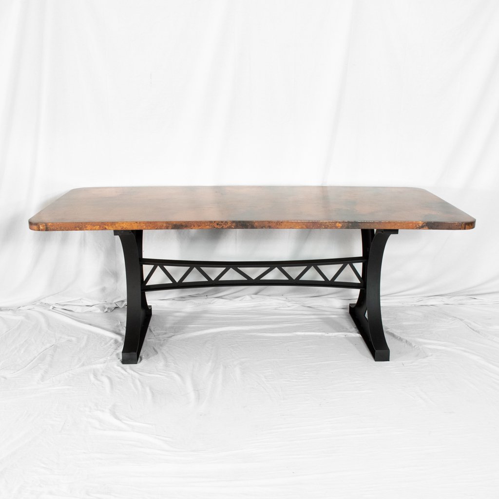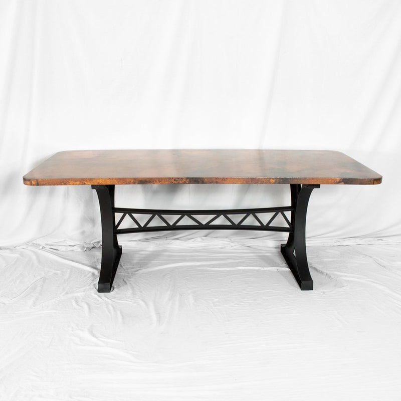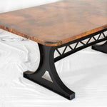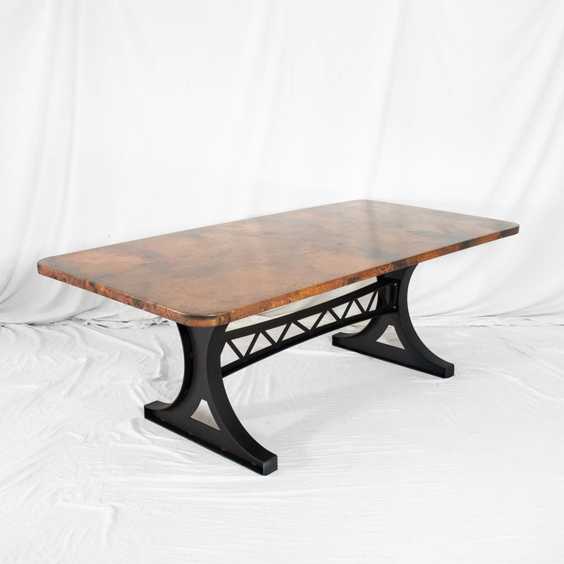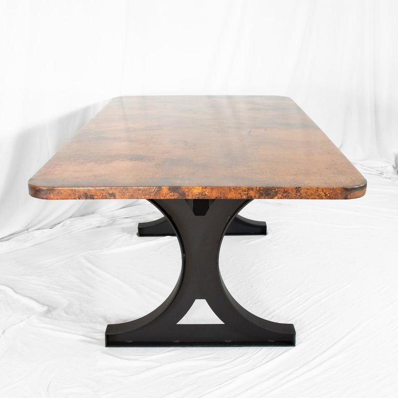 This stout and sturdy, stunner of a dining table leaves you wanting only for guests to surround it. A gorgeous, hand-crafted copper tabletop rests atop the iron Tacoma trestle dining table base. The copper tabletop comes standard with a light hand-hammered texture and the matte black base pairs beautifully to create a mixed medium dining table that will blend effortlessly into any dining space. The Tacoma copper dining table is available in three standard sizes, but can be fully customized to suit any space you want to fill.
