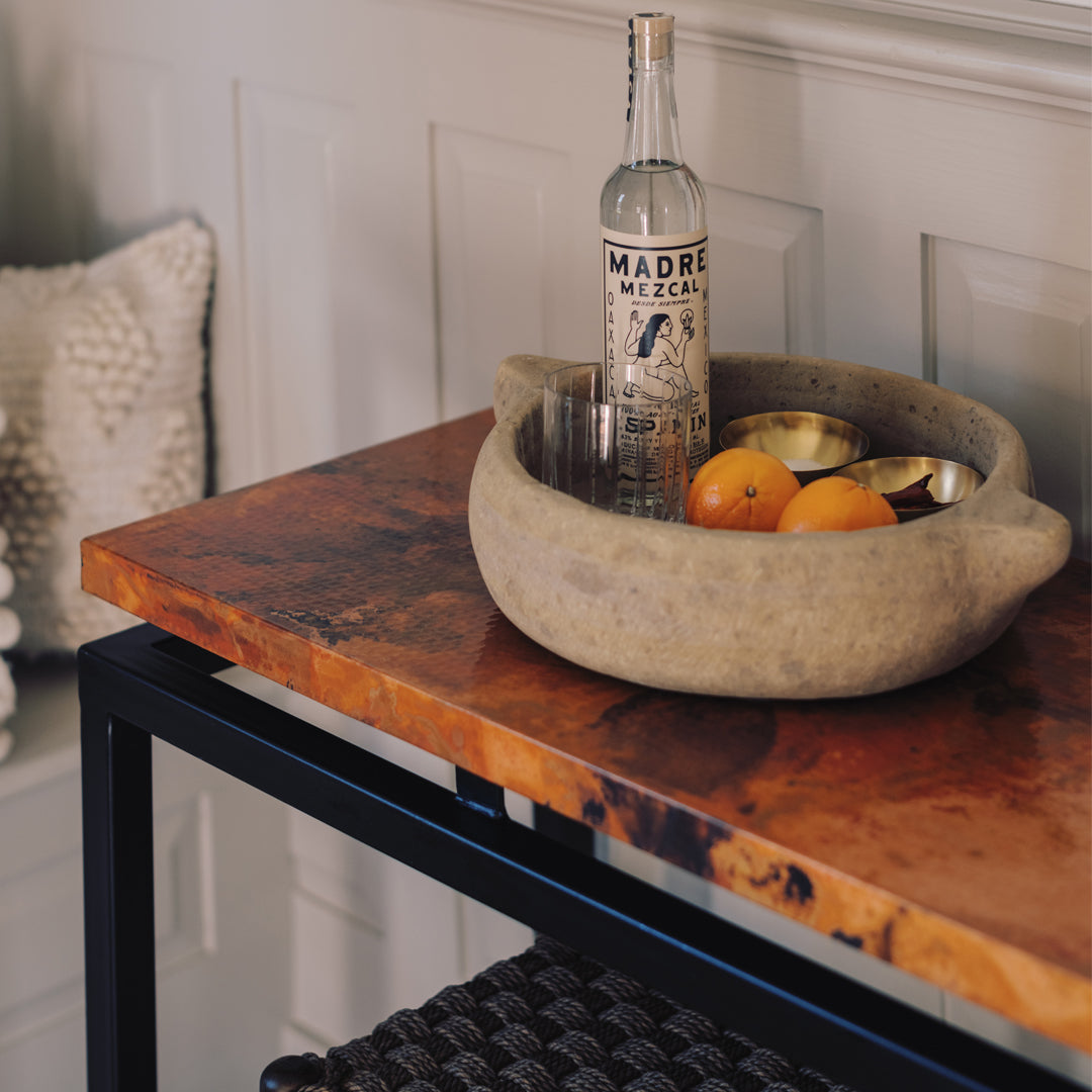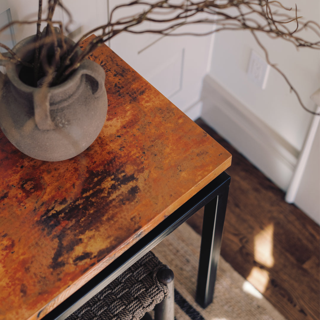 We can alter the shape, length, width, thickness, patina and substrate materials for our copper tabletops. As most of our copper tabletops and iron table bases are crafted on a made-to-order basis they can be customized to suit your needs and space.