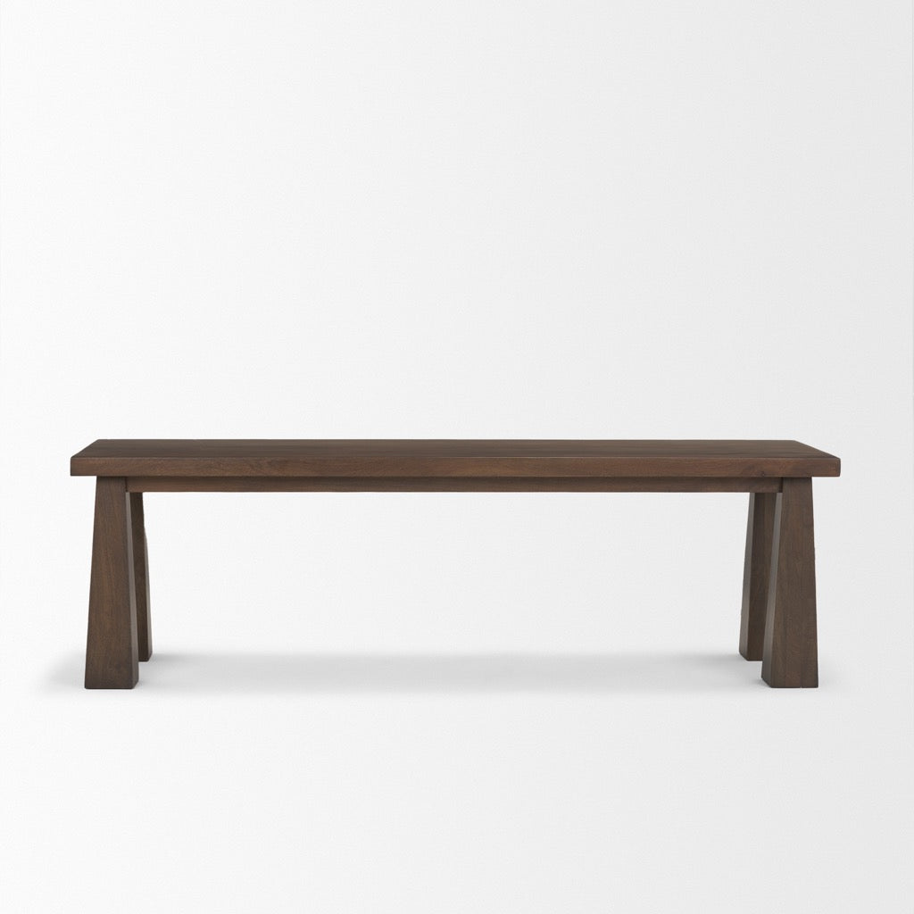 Wolcott is a solid mango wood rectangular bench with four angular legs, all finished in a rich dark brown.