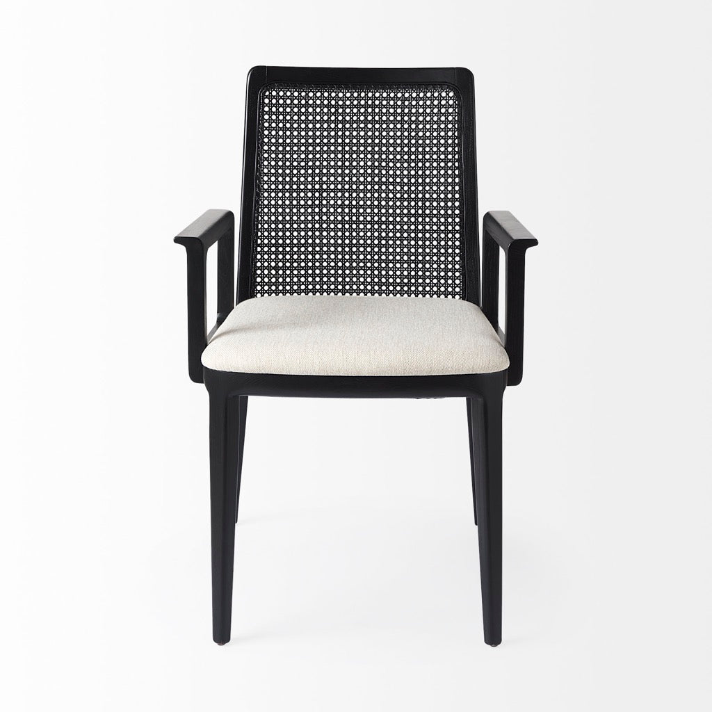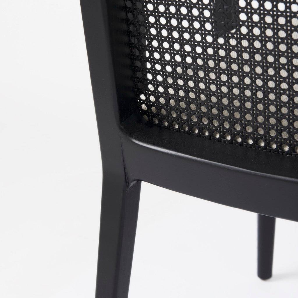 - Black and Cream Finish: A black painted finish, spanning the wooden frame and cane back, lends a modern edge, while the creamy beige cushion softens the look and conveys a sense of comfort.