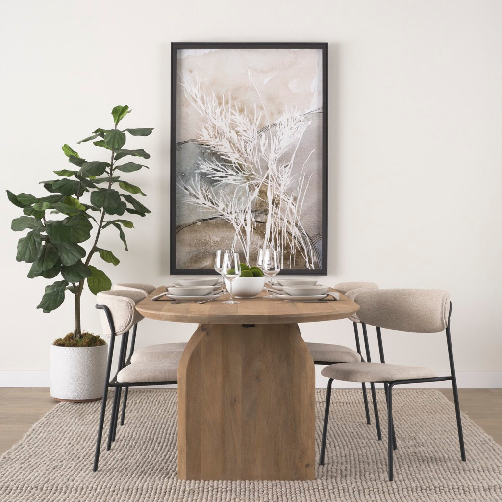 The Corey Dining Chair is upholstered with an oatmeal fabric set on a matte black metal frame.