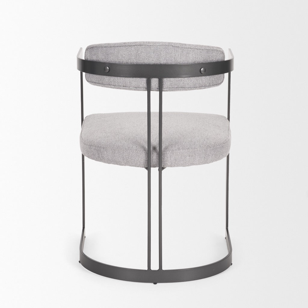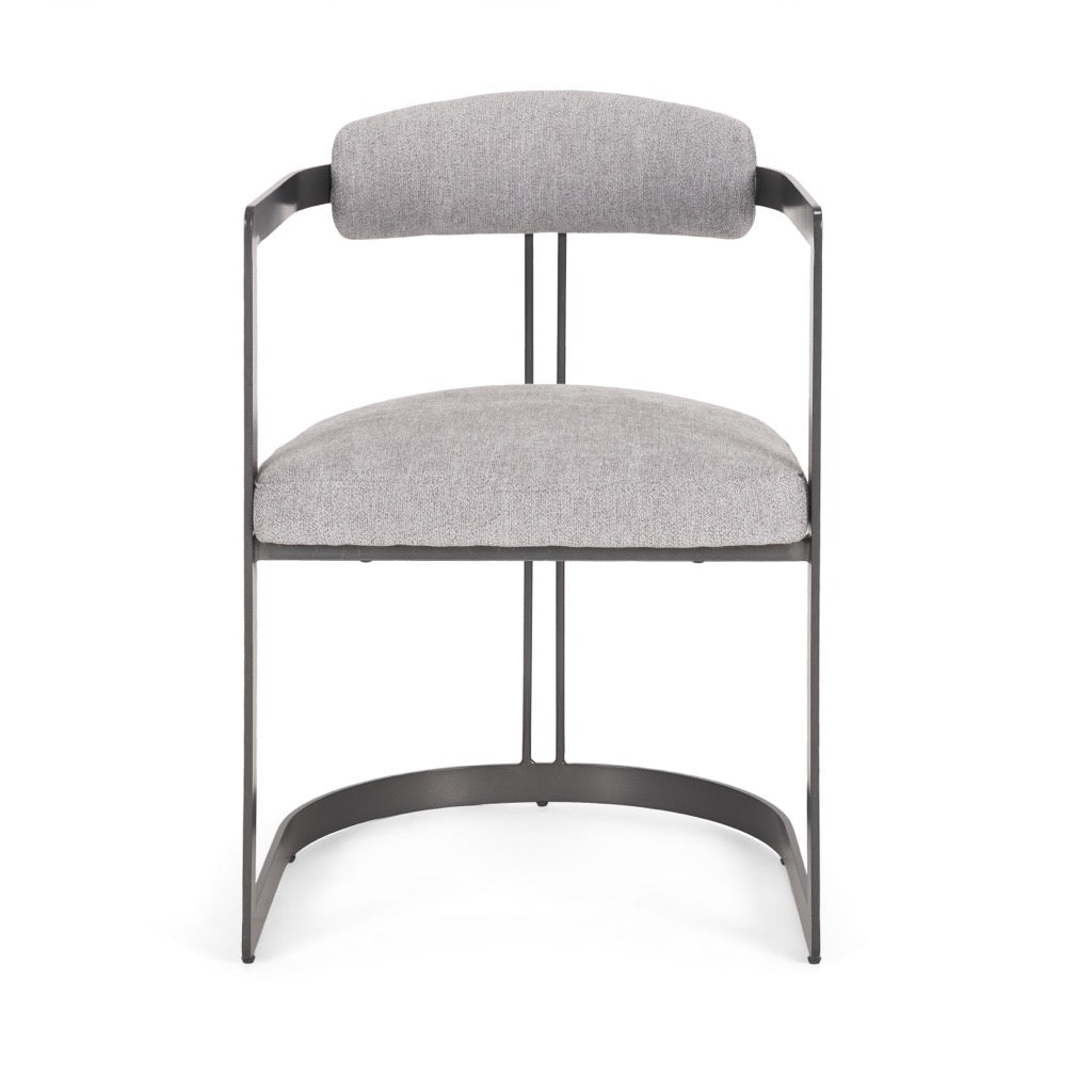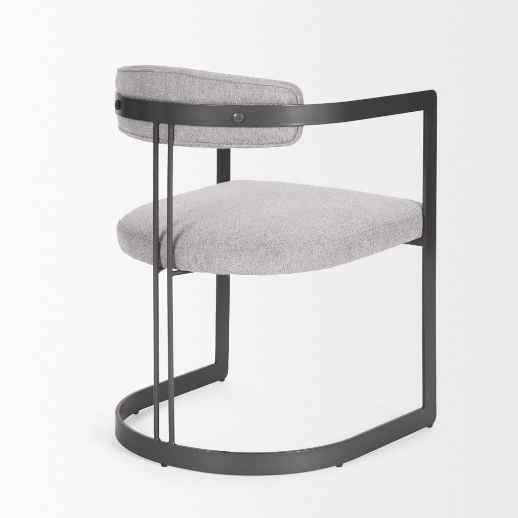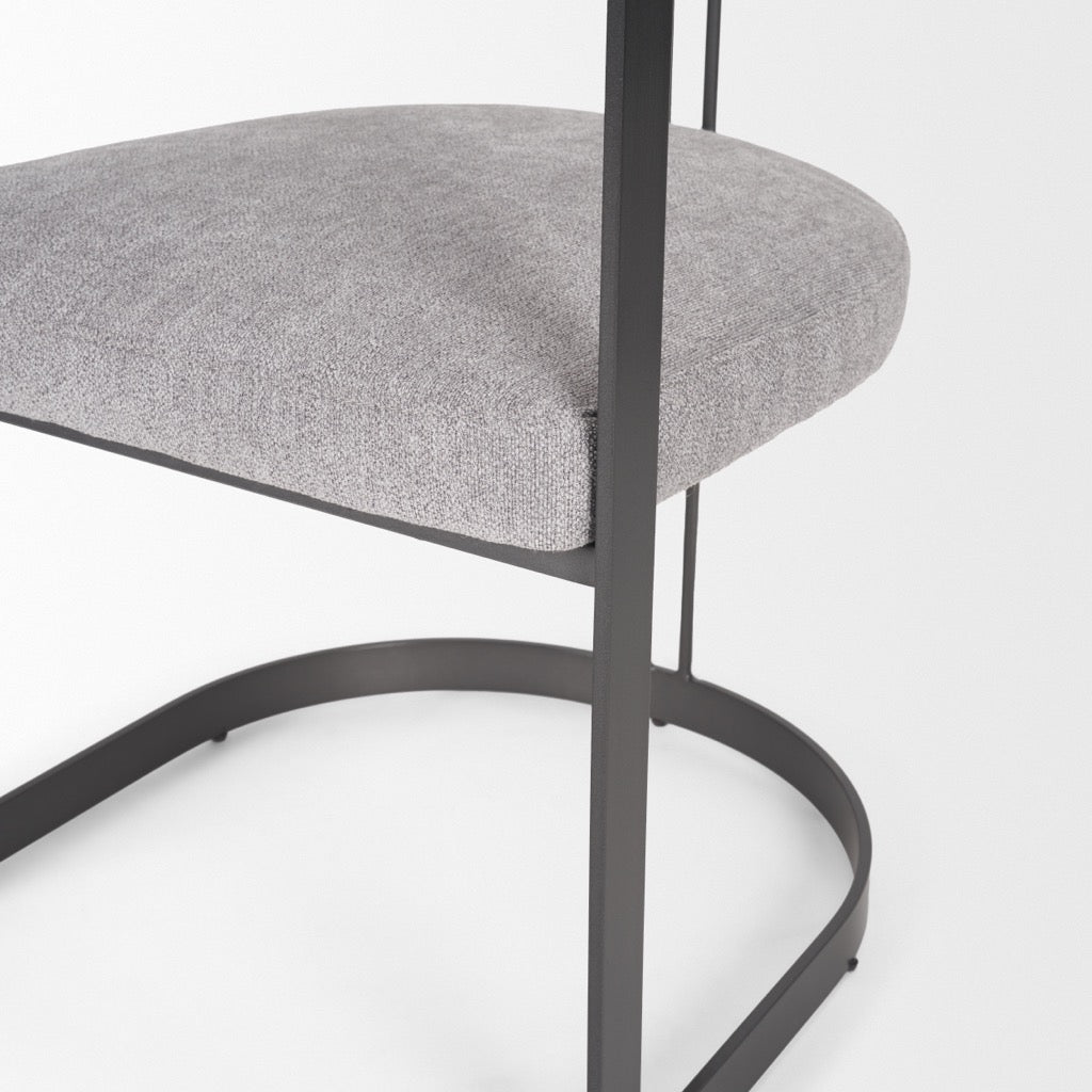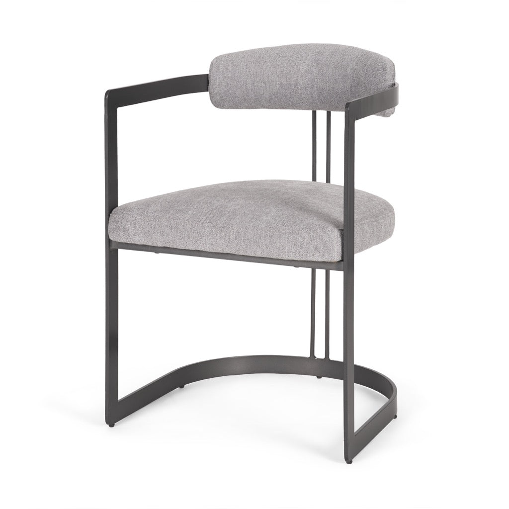 The Hollyfield is an armchair with gray fabric seating and backrest supported by a U-shaped flat metal frame.